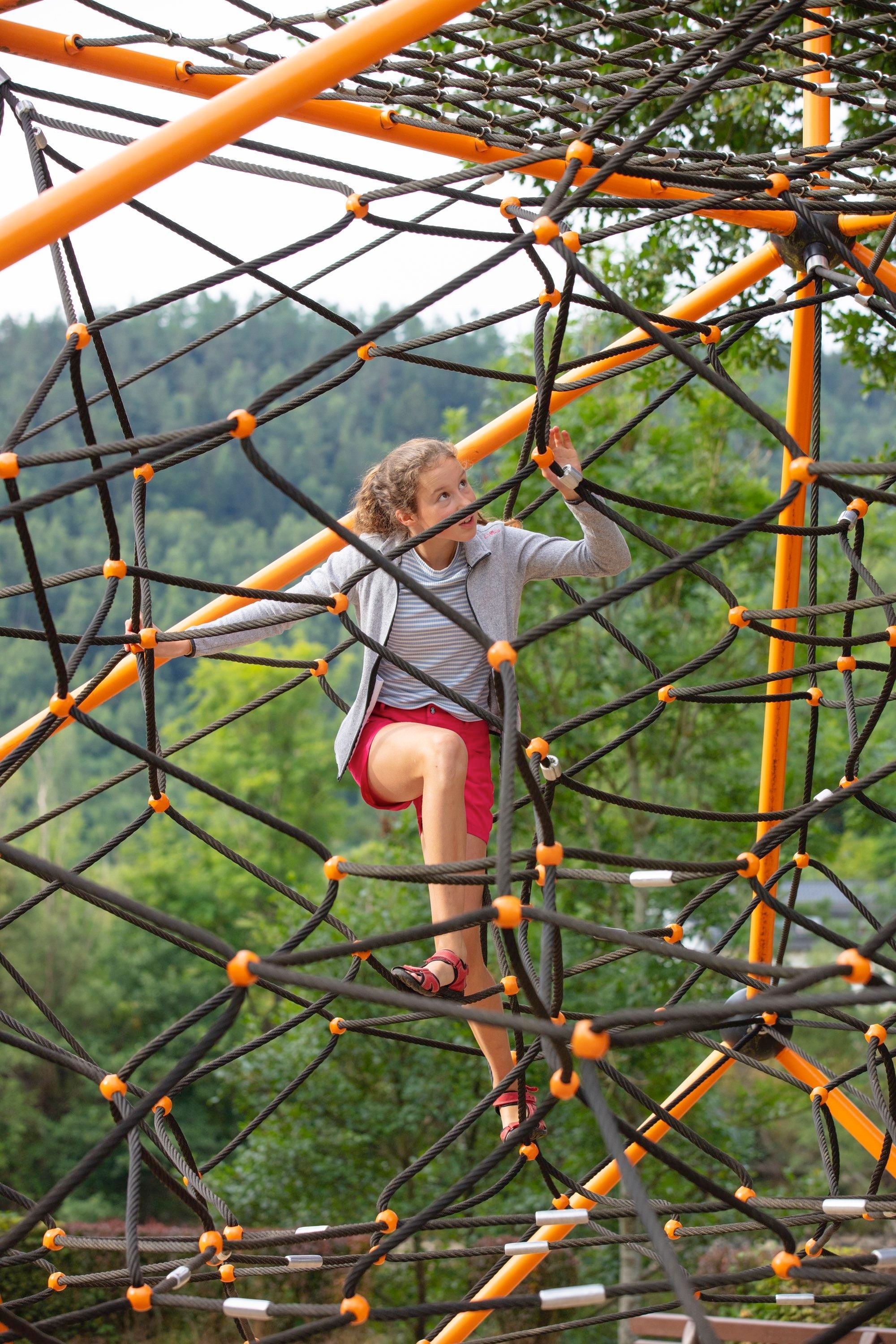 Puur klimplezier! De grote klimpiramide is het hoogtepunt van de speeltuin aan het meer in Simmerath-Einruhr. Elke kleine en grote klimmende aap kan zich hier uitleven. De speeltuin is vrij toegankelijk. In de directe omgeving zijn er verschillende plaatsen waar u kunt stoppen voor een verfrissing, evenals de aanlegsteiger van de Einruhr-boot.