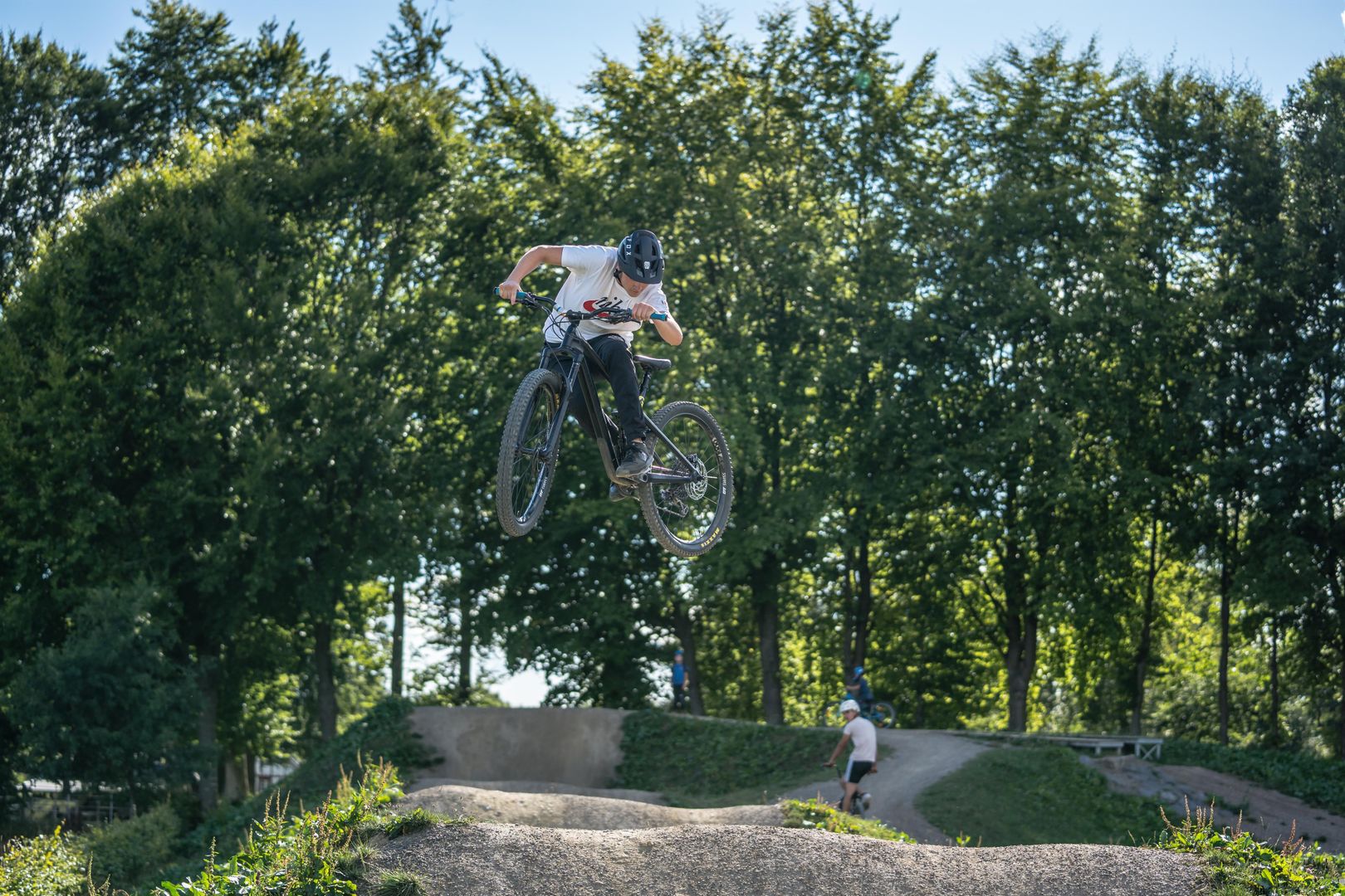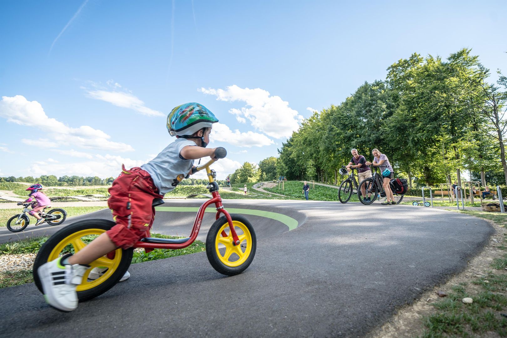Verschillende gebieden vormen samen een grote avontuurlijke speeltuin voor fietsliefhebbers. Zelfs de allerkleinsten kunnen hun eerste rondjes op een fiets of loopfiets maken op de kinderbaan, terwijl gevorderde renners echt snelheid kunnen opbouwen op de pompenbaan. De pompbaan, ontworpen als een eindeloze lus met ingebouwde golven, bochten en sprongen, is ideaal om actief te fietsen. De jumpline brengt je hoog op verschillende opeenvolgende sprongen. Techniek en balans staan centraal in de skills area, waar verschillende uitdagingen met houten elementen op je wachten. Wortelpassages kunnen ook worden geoefend op het steen- en wortelparcours. Voor een pauze tussendoor is er ook een klein recreatiegebied met een gezellige hut, tafels en banken.