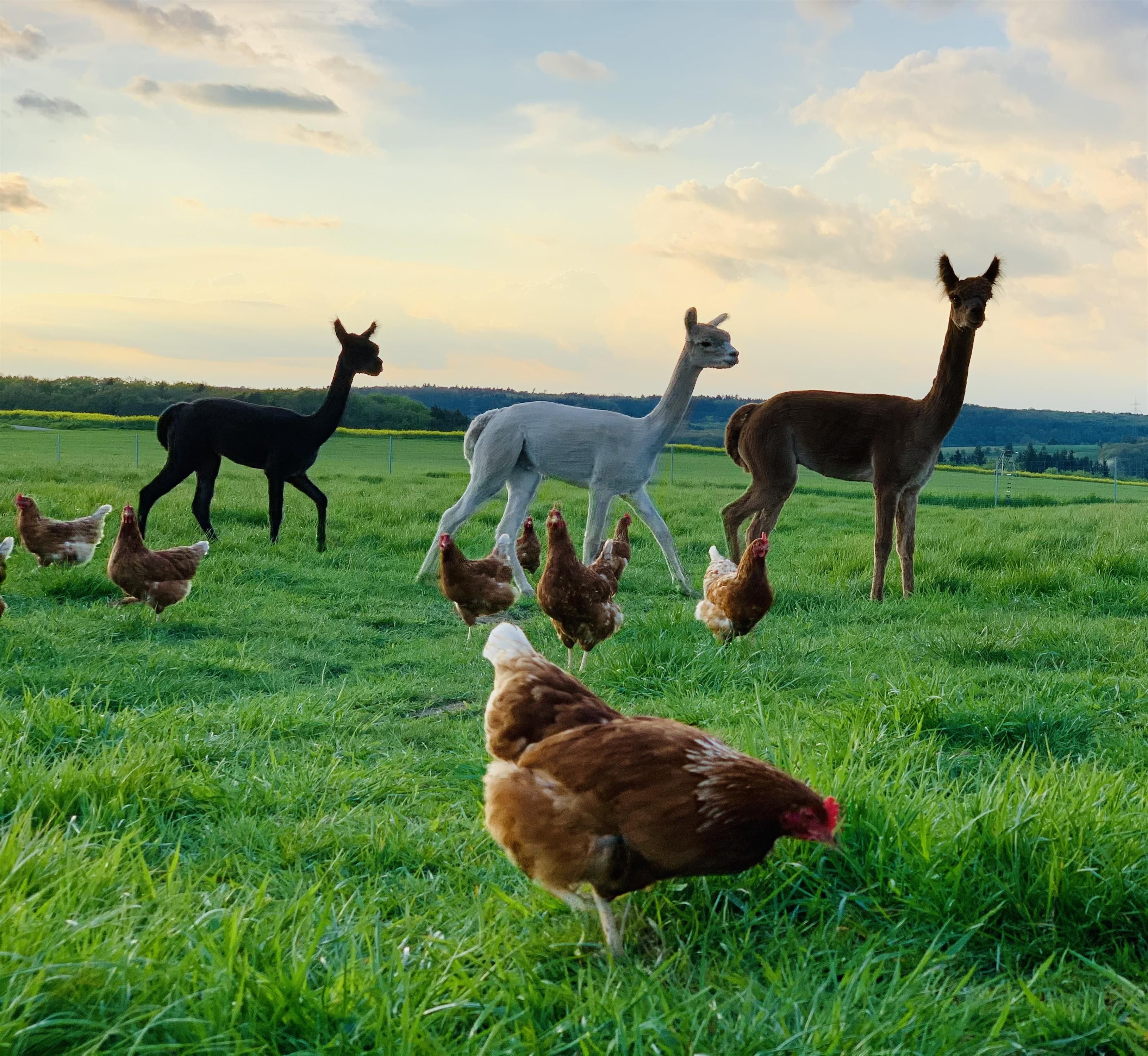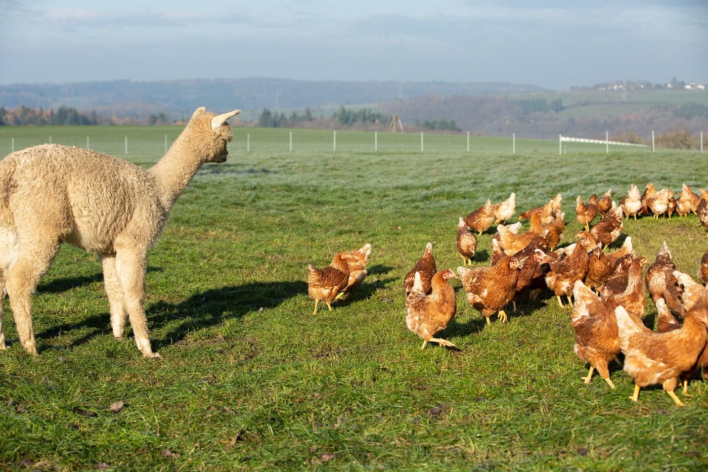 Vanuit de ruime tuin heb je een prachtig uitzicht over onze grote alpaca- en kippenweiden tot aan het dal van de Kyll met zijn bossen en weiden.