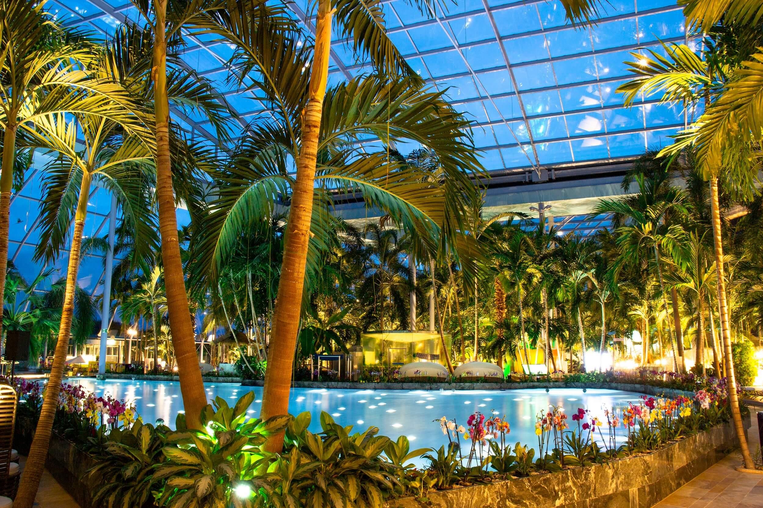 Onder het motto 'Mijn vakantieparadijs onder palmen' staat de bezoekers een vakantiewereld van absolute topklasse te wachten. Het enorme subtropische zwemparadijs met saunacomplex ligt midden in de aantrekkelijke uiterwaarden van de Erft, vlak bij de Eifel en niet ver van populaire steden als Bonn, Keulen of Düsseldorf. Dankzij het brede spectrum aan recreatieve mogelijkheden, net over de grens in Duitsland vindt iedereen, onafhankelijk van het weer, op 365 dagen per jaar zijn eigen 'paradijs'. In licht badende, paradijselijke oases met meer dan 500 echte palmen uit de Zuidzee garanderen net als de tropische temperaturen puur vakantiegevoel in het Palmenparadies. Genieten is ook gegarandeerd in de Vitaltherme & Sauna met unieke, innovatieve en thematische sauna-highlights die voor ontspanning en weldadige momenten zorgen - voor lichaam, geest en ziel. De kers op de taart van deze belevenis is het gratis activiteitenprogramma met meer dan 60 activiteiten zoals opgietingen, peelings en aquafitcursussen per dag. Adembenemende evenementen met gevarieerde motto's en showprogramma's, zoals de textielvrije saunanachten, vormen de afronding van uw vakantiedag onder de palmen. Dit staat u te wachten: - 3.000 m² rust in het Palmenparadies - 3.000 m² genot in de Vitaltherme & Sauna - 15.000 m² buitenterrein - Meer dan 500 echte palmen - 10 sauna-highlights met elk een exclusief thema & 2 stoombaden - Watertemperatuur Palmenparadies ca. 33 °C - Watertemperatuur Vitaltherme & Sauna ca. 24 °C & 33 °C - Luchttemperatuur ca. 34 °C - Exclusieve lig- en relaxruimtes - Culinaire highlights in 2 exclusieve restaurants - 4 poolbars om zowel binnen als buiten te genieten - Meer dan 50 loungers met jets - Cabriodak met ca. 1.700 m² oppervlak in het Palmenparadies - 2 cabriodaken à 250 m² in de Vitaltherme & Sauna - 4 baden met heilzame werking, whirlpools, massage jets - Sportzwembad met duiktoren, 5 x 25 meter banen, watertemperatuur ca. 28 °C