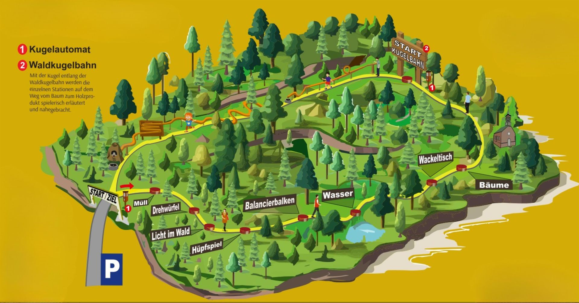 Hoogtepunt is de ongeveer 400 meter lange boskogellbaan, die aan het einde van de ronde ligt. Een gigantisch plezier voor kinderen! De ballen zijn elk moment voor slechts één euro verkrijgbaar bij de ballenautomaat ter plaatse – gooi gewoon een passende euro munt in en je bent klaar voor de start!