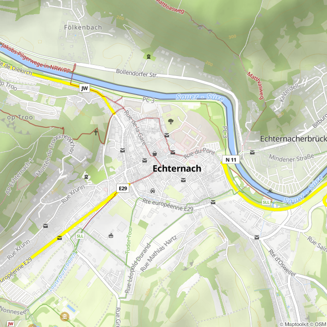 Die charmante Kleinstadt ist am besten über den kulturhistorischen Rundweg zu erschließen, welcher während der zweistündigen Dauer die wichtigsten architektonischen Besonderheiten und die geschichtliche Entwicklung der Stadt erschließt. Wer die Stadt lieber auf eigene Faust erschließen möchte, kann dieses auf vielfältige Weise machen, da Echternach gerade dem kulturinteressierten Besucher eine Vielzahl an Möglichkeiten bietet. Das Infoforum Echternach informiert in der größten römischen Villenanlage des Landes über das Leben der Römer und das Leben auf einem Gutshof. Besonders das religiöse Erbe wird in Echternach deutlich, welches auf den heiligen Willibrord zurückgeht. Das heutige Stadtbild wird von der St. Willibrord Basilika sowie der Echternacher Abtei dominiert. Am bekanntesten dürfte jedoch die Springprozession von Echternach sein, welche alljährlich nicht nur viele Gläubige in die Stadt zieht, sondern auch viele Besucher, welche sich dieses Spektakel nicht entgehen lassen wollen.