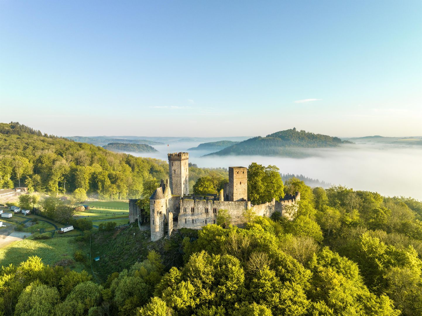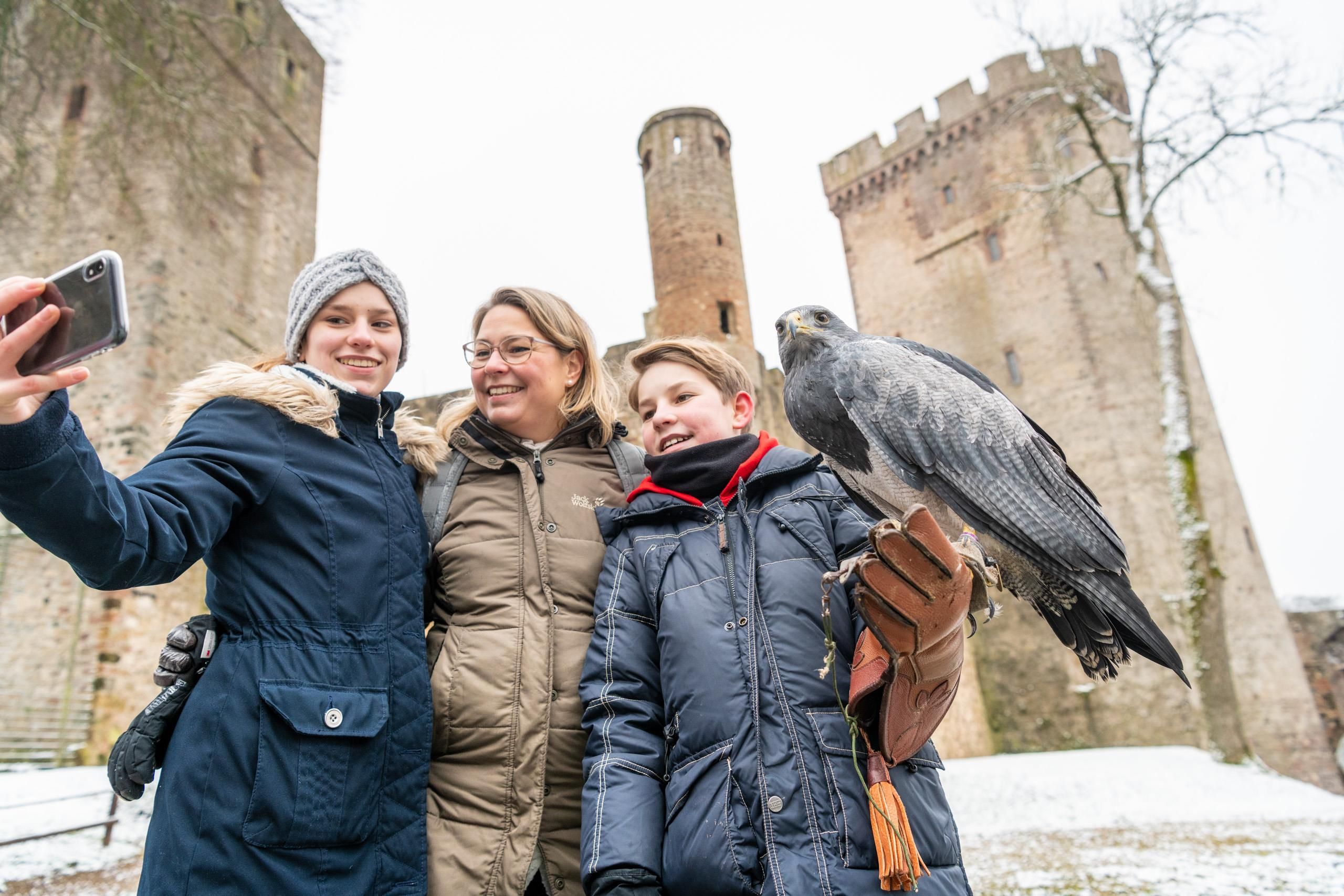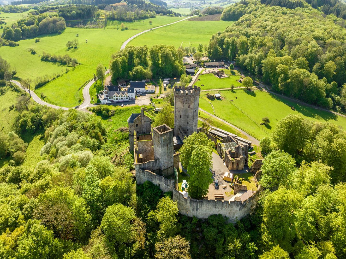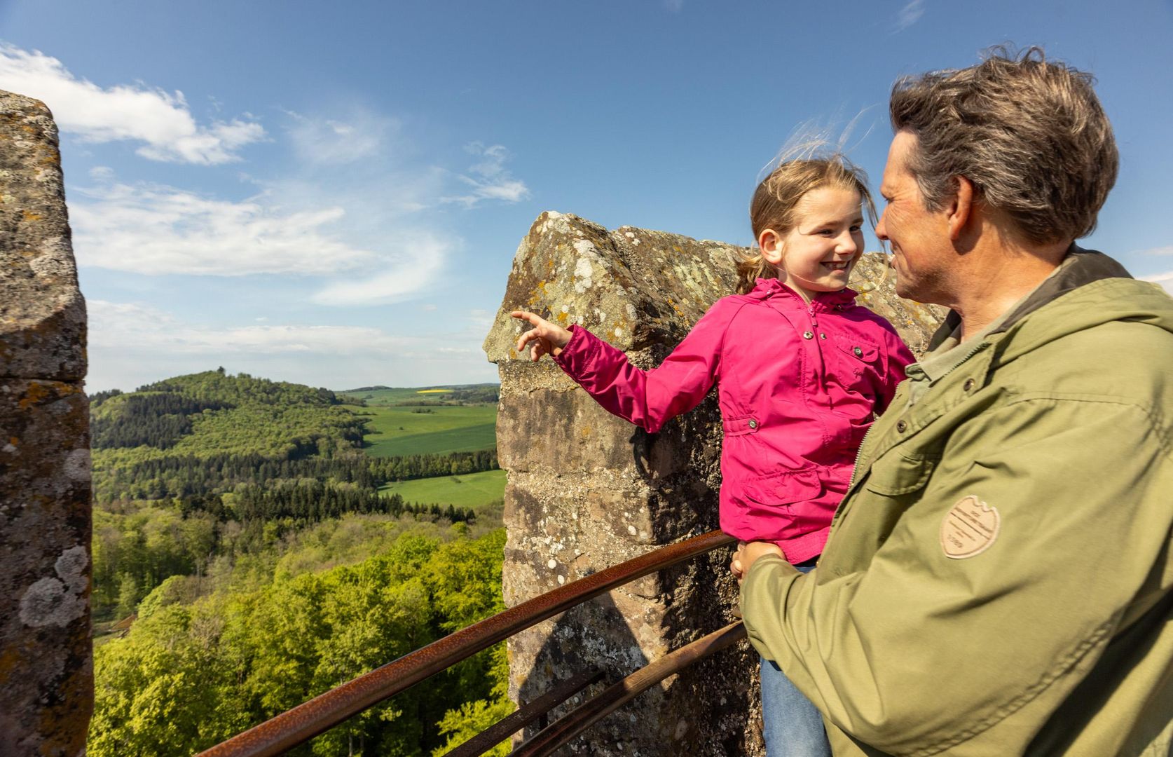 Hoch über dem Eifel-Flüsschen Kyll und auf einem senkrecht aufragenden Massiv aus Dolomitgestein und Basalt thront die Kasselburg. Unverwechselbar wird sie durch einen imposanten Doppelwohnturm, der die aus dem 12. Jahrhundert stammende Burganlage weithin sichtbar zum Markenzeichen des Gerolsteiner Landes macht. Die gut erhaltene Ruine lässt nicht nur das Herz großer und kleiner Mittelalterfans höher schlagen, sie birgt auch ein tierisch spannendes Geheimnis. Denn sie beherbergt den Adler- und Wolfspark Kasselburg mit vielen majestätischen Greifvögeln, die ihre Luftakrobatik in Flugshows zeigen, und mit dem größten, auf zehn Hektar Wald- und Felsgelände halbwild lebenden Wolfsrudel Westeuropas.