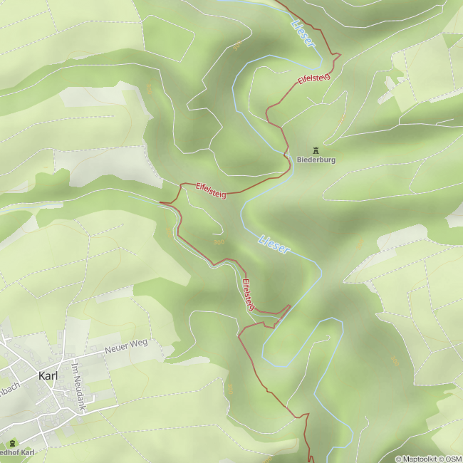 Die Aussichtsplattform am Burgberg bei Karl liegt hoch über dem Liesertal eröffnet einen weiten Blick in die Eifel-Landschaft. Perfekt für eine gemütliche Wanderrast ist auch die benachbarte Hütte mit ihren Holzbänken.