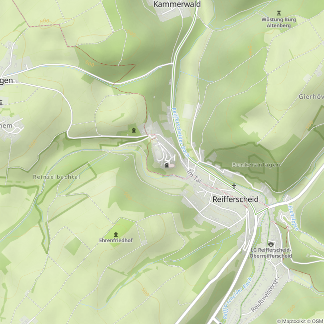 Nahe an der Grenze zwischen Eifel und Ardennen in der Gemeinde Hellenthal liegt die 1106 erstmals erwähnte Burg Reifferscheid, eine für die Eifel typische mittelalterliche Höhenburg. Die heutige Anlage aus Schlossruine, Vorburg und befestigter Burgsiedlung spiegelt den Wandel dieses einstigen Herrschaftssitzes wider. Am 23. Juni 1669 löste die Unvorsichtigkeit eines Soldaten einen Brand aus, der die Burg Reifferscheid und große Teile des Oberdorfes vernichteten. Danach wurde die Burg als Barockschloss wieder aufgebaut. Schließlich wurde das Schloss abermals in den Reunionskriegen Ludwigs XlV. teilweise zerstört und wieder aufgebaut. 1805 wurde Schloss Reifferscheid versteigert. Mehr und mehr dem Verfall preisgegeben, diente es dann über lange Zeit als Steinbruch und verkam zur Ruine. Die gut erhaltene Vorburg, die Ringmauer mit zwei Stadttoren und Überresten des Schlosses, sowie ein - so gut wie unveränderter - 600 Jahre alter Stadtgrundriss sind überaus sehenswert. Die Kath. Pfarrgemeinde St. Matthias bietet regelmäßig sonntags Führungen durch den Burgbering und die Kirche an. In St. Matthias wurden im 17. Jahrhundert die Grafen von Salm-Reifferscheid bestattet. Die Grablege geriet in Vergessenheit und wurde erst im 19. Jahrhundert wieder entdeckt. Alle zwei Jahre (in den geraden Jahren) findet am dritten Septemberwochenende das Burgfest mit dem mittelalterlichen Spielmanns- und Gauklerprogramm statt. Am ersten Adventswochenende findet jährlich der Weihnachtsmarkt in der Burganlage statt. Die Burg Reifferscheid liegt direkt an der Burgen-Route.