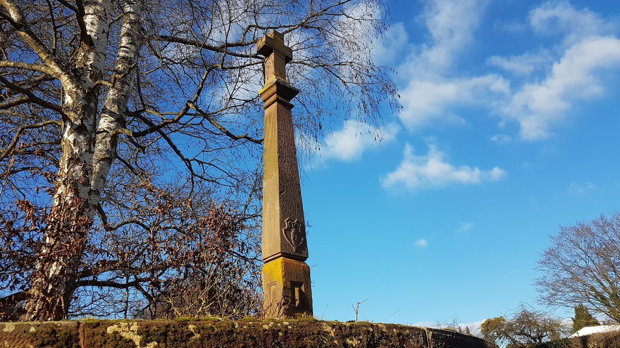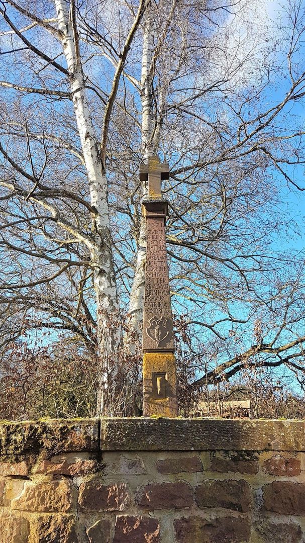 Das fast drei Meter hohe schlanke Schaftkreuz in der äußersten Ecke des Schlossparks trägt den typischen Formenschmuck des Barocks. Den auffallend hohen, rechteckigen Kreuzfuß schmücken Diamantquader vorne und an den Seiten. Nach einer "Abschnürung" erhebt sich darüber ein sich nach oben hin verjüngender Kreuzschaft, der fast völlig von der Inschrift bedeckt wird.
