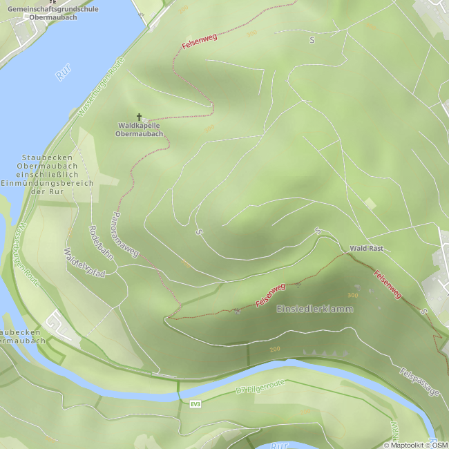 Dieser Eifel-Blick, auf der Mausauel oberhalb des Staubeckens Obermaubach gelegen, befindet sich auf einer Höhe von 350 Meter über den Meeresspiegel und bietet Ihnen in südwest- bis nordwestlicher Richtung einen Fernblick über die Hochfläche der Rureifel und den Hürtgenwald bis hin zum Hohen Venn.