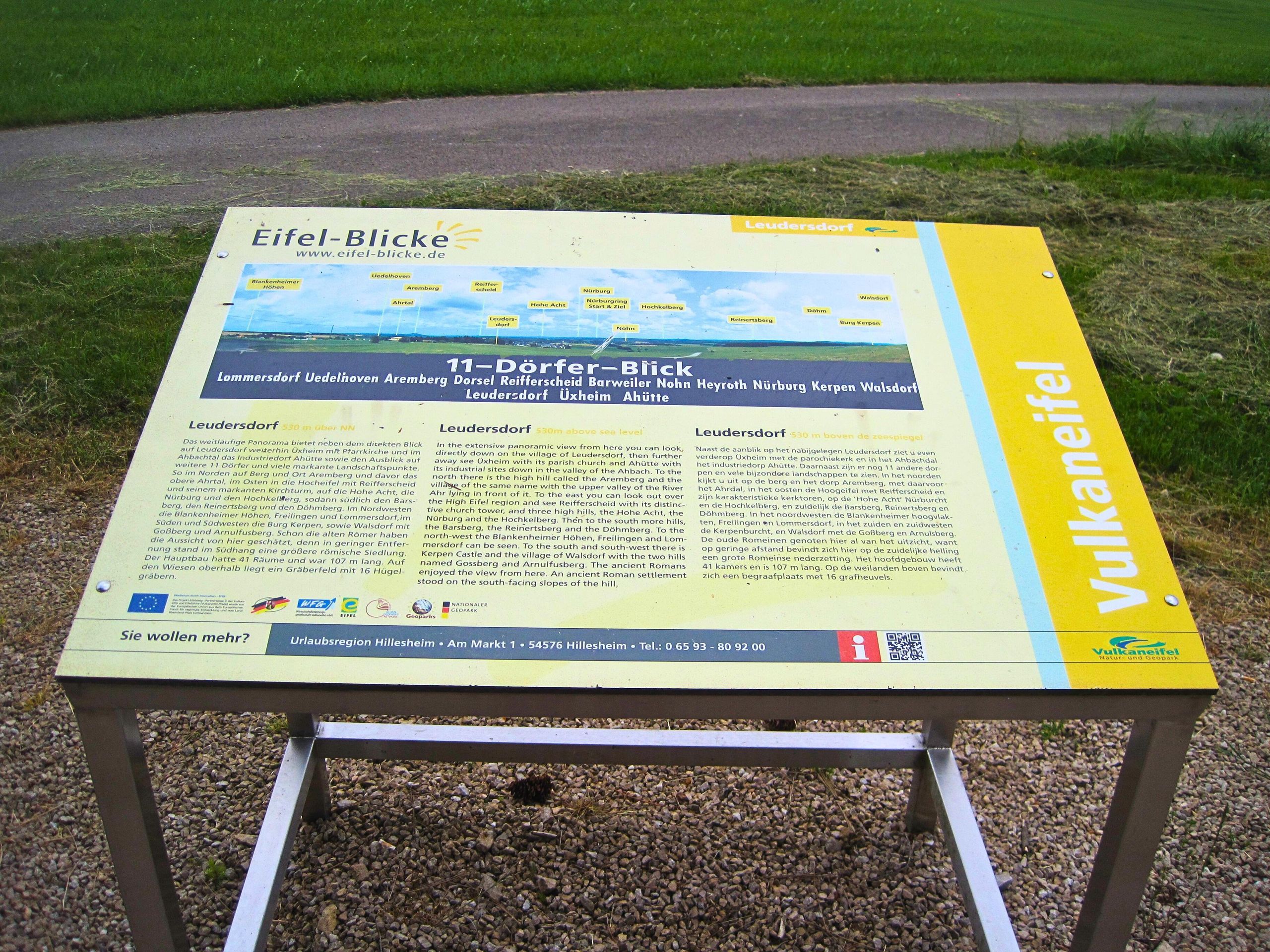 Der Eifel-Blick Leudersdorf bietet den Wanderern ein weitläufiges Panorama. Sie blicken direkt auf Leudersdorf, einem Ortsteil von Üxheim im Hillesheimer Land bis hin zum Industriegebiet Ahütte im Ahrbachtal.
