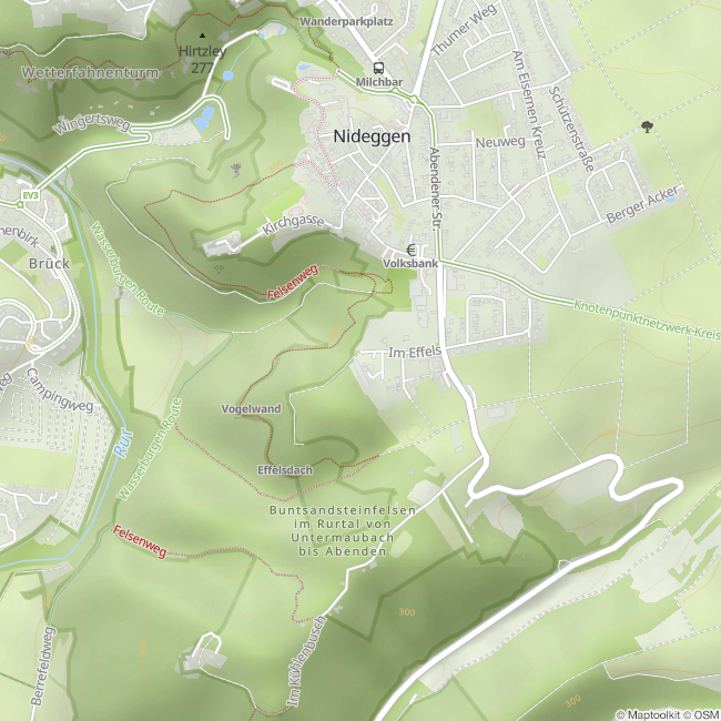 Autobahn A4 Richtung Köln bis Ausfahrt Düren, dann Richtung Düren und weiter auf die B56 nach Zülpich / Euskirchen. Am Kreisel in Froitzheim Richtung Nideggen abbiegen und dem Straßenverlauf ca. 6 km folgen. Im Kreisverkehr zweite Ausfahrt nehmen und auf die Jülicher Straße (L249) wechseln. Dann links abbiegen auf die Abendener Straße und dann rechts in Richtung Im Effels abbiegen.