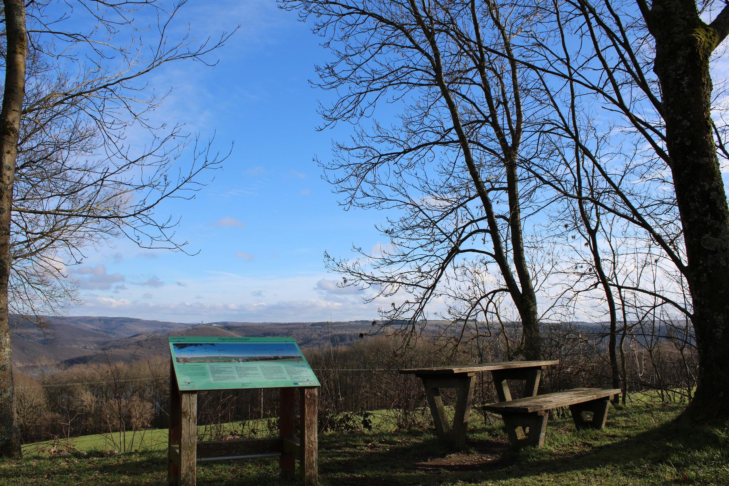 Auf einer Höhe von 470m liegt der Eifel-Blick bei der Jugendherberge Rurberg. Über den Rursee hinweg reicht der Blick bis hin zum Nationalpark Eifel. Das gesamte sichtbare Waldgebiet am Horizont gelegen, gehört zum Nationalpark Eifel, dem einzigen seiner Art in ganz Nordrhein-Westfalen. Links erstreckt sich der Blick über den Kermeter. Weiter rechts liegt die Dreiborner Hochfläche und es bietet sich ein wunderbarer Fernblick auf das Areal von Vogelsang IP. Gut erkennbar in der Ferne ist der hohe Turm der Anlage, der in den Himmel ragt. Ein toller Rastplatz, um anzuhalten und die Sicht zu genießen.
