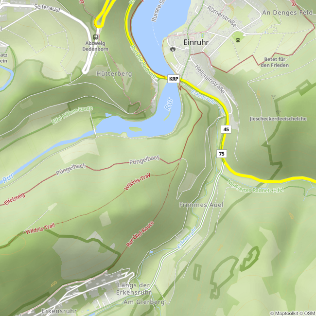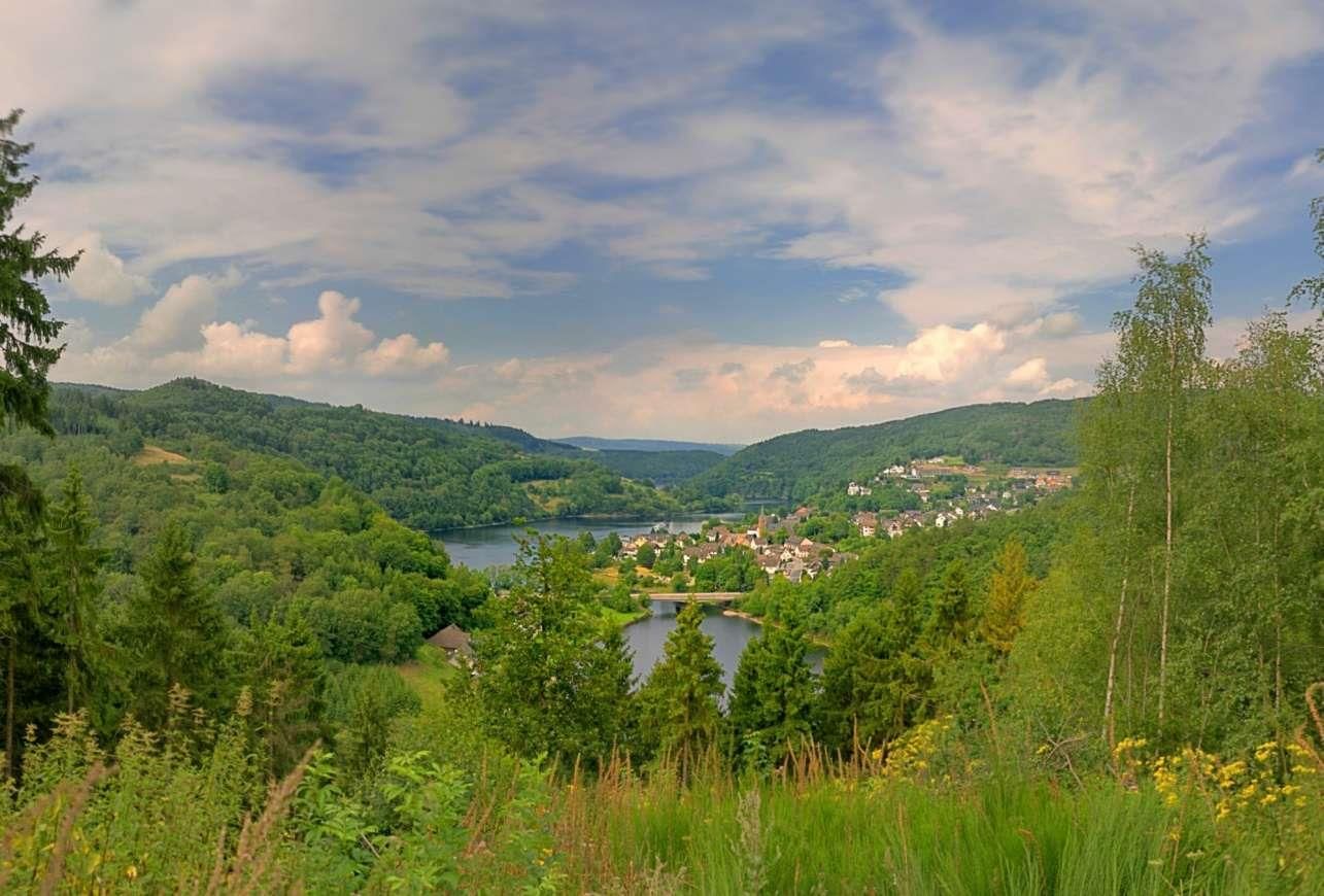 Auf einer Höhe von 360m liegt der Eifel-Blick „Wolfshügel“ hoch über Einruhr. Diese exponierte Lage ermöglicht einen fantastischen Blick auf das sehenswerte Eifelörtchen. Über den Ort hinweg erstreckt sich ein einmaliger Fernblick über den Obersee bis hin zu dem Waldgebiet Buhlert. Die im Vordergrund sichtbare Rurbrücke wurde im 19. Jahrhundert erbaut und war die erste Steinbrücke, die über die Rur führte.