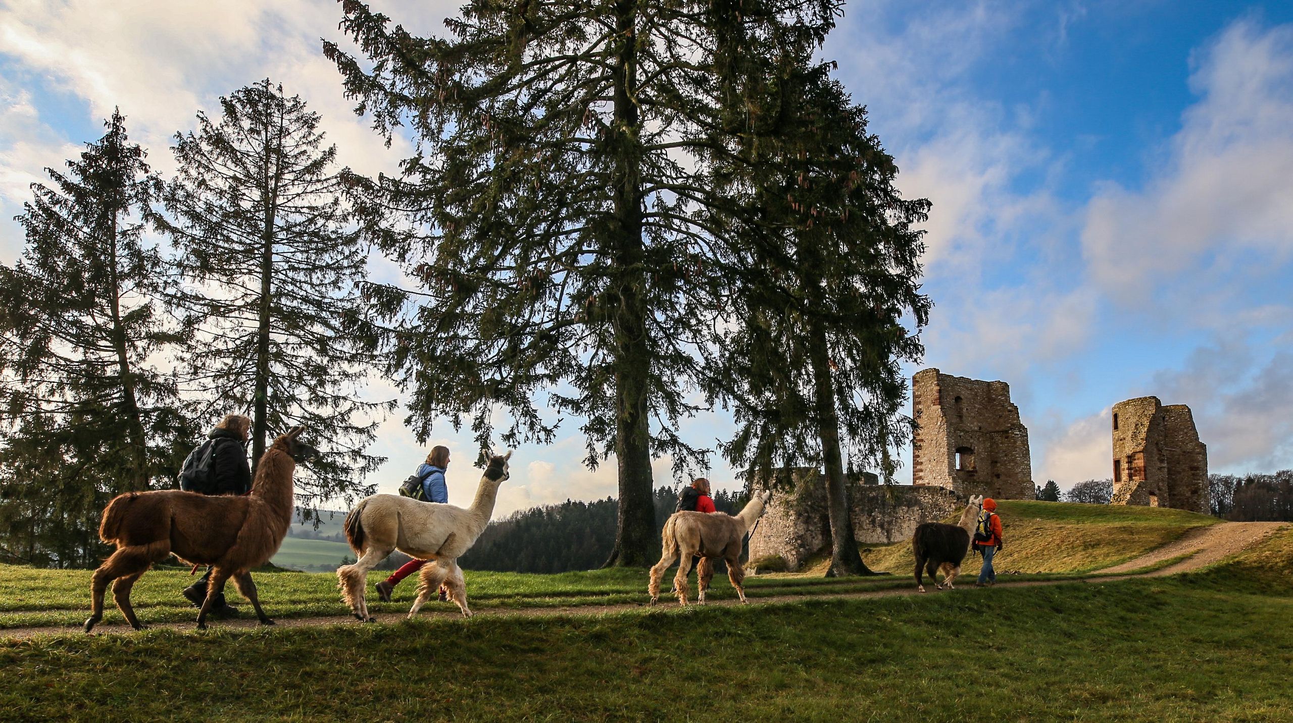 Die Lama-Touren führen mit gut ausgebildeten Guides und flauschiger tierischer Begleitung je nach Interesse der Gäste zu botanischen, kulturellen, geologischen oder historischen Sehenswürdigkeiten der Schönecker Schweiz und anderer Teilregionen der Eifel.