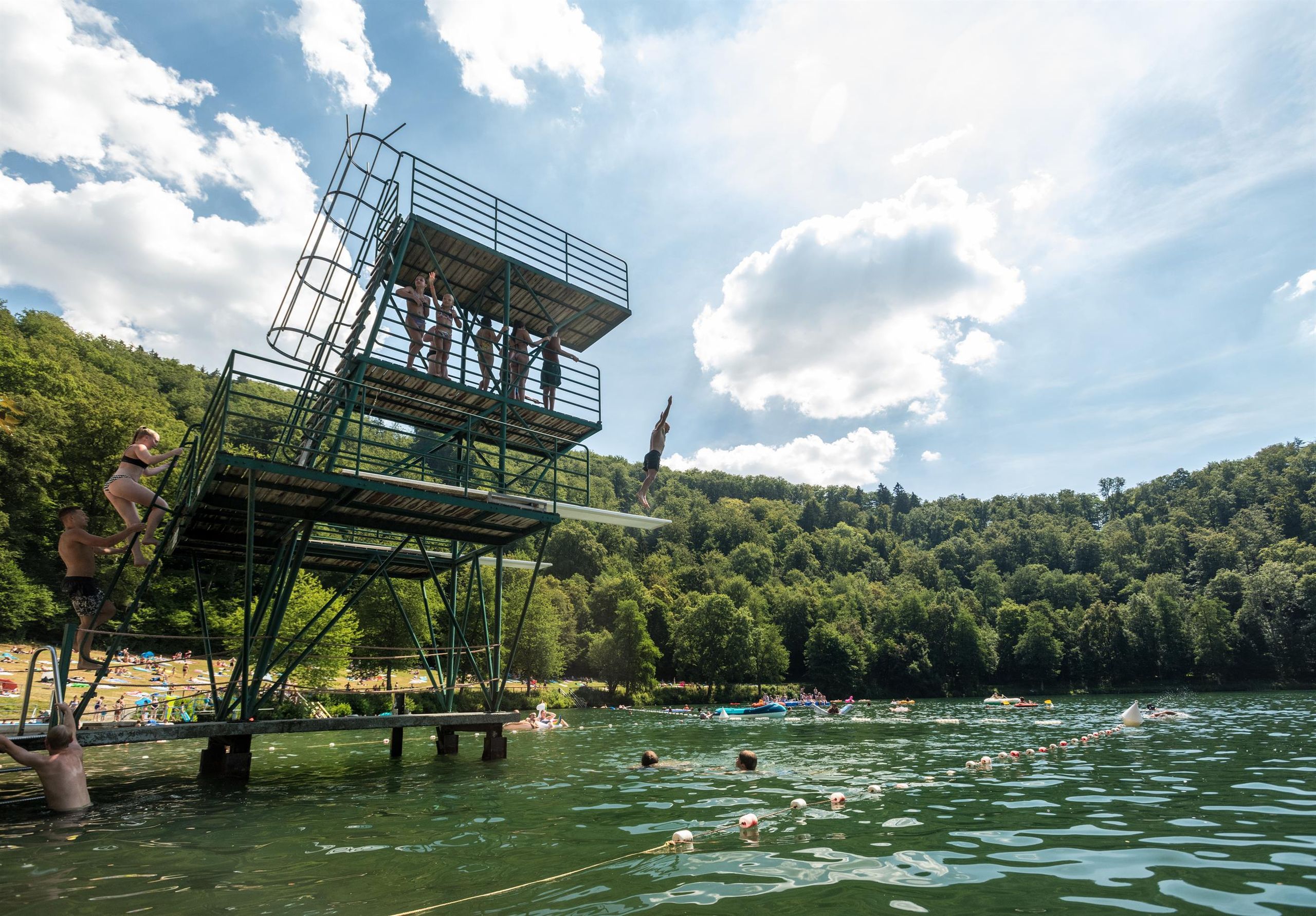 Für Sprungbegeisterte gibt es im Naturfreibad ein 1-Meter-Brett und einen Sprungturm mit verschiedenen Höhen (2 x 3,0 m, 5,0 m und 7,5 m). Die Wassertiefe unter dem Turm beträgt ca. 4 Meter und nimmt zur Maarmitte stark zu. Weitere Attraktionen umfassen eine kleine Kletterwand, ein Nichtschwimmerbecken (10 m x 10 m, bis zu 1,35 m tief), ein Babybecken, einen Sandkasten und eine Badeinsel außerhalb des abgegrenzten Bereiches.