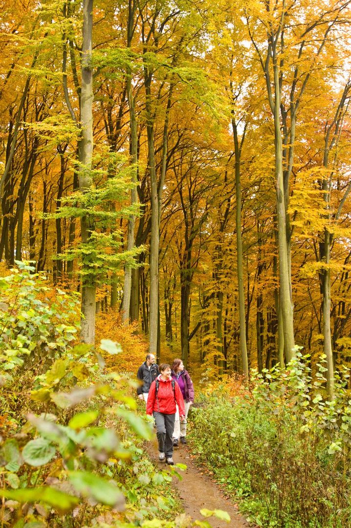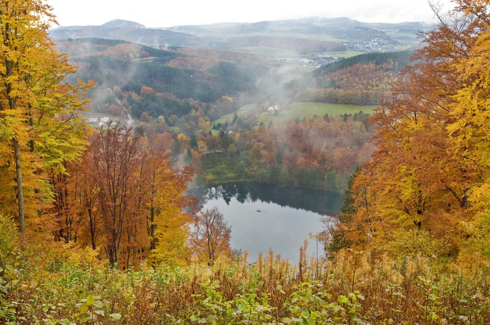 Kommt man zu Fuß vom Weinfelder Maar über den Wanderweg Eifelsteig, so öffnet sich der Blick von oben auf das 150 Meter tiefer liegende Maar - eine atemberaubende Szenerie in Dunkelblau und frischem Grün. Im Herbst scheint der Wald bunt zu leuchten, zwischen Laub und Holz gedeihen faszinierende Pilze.