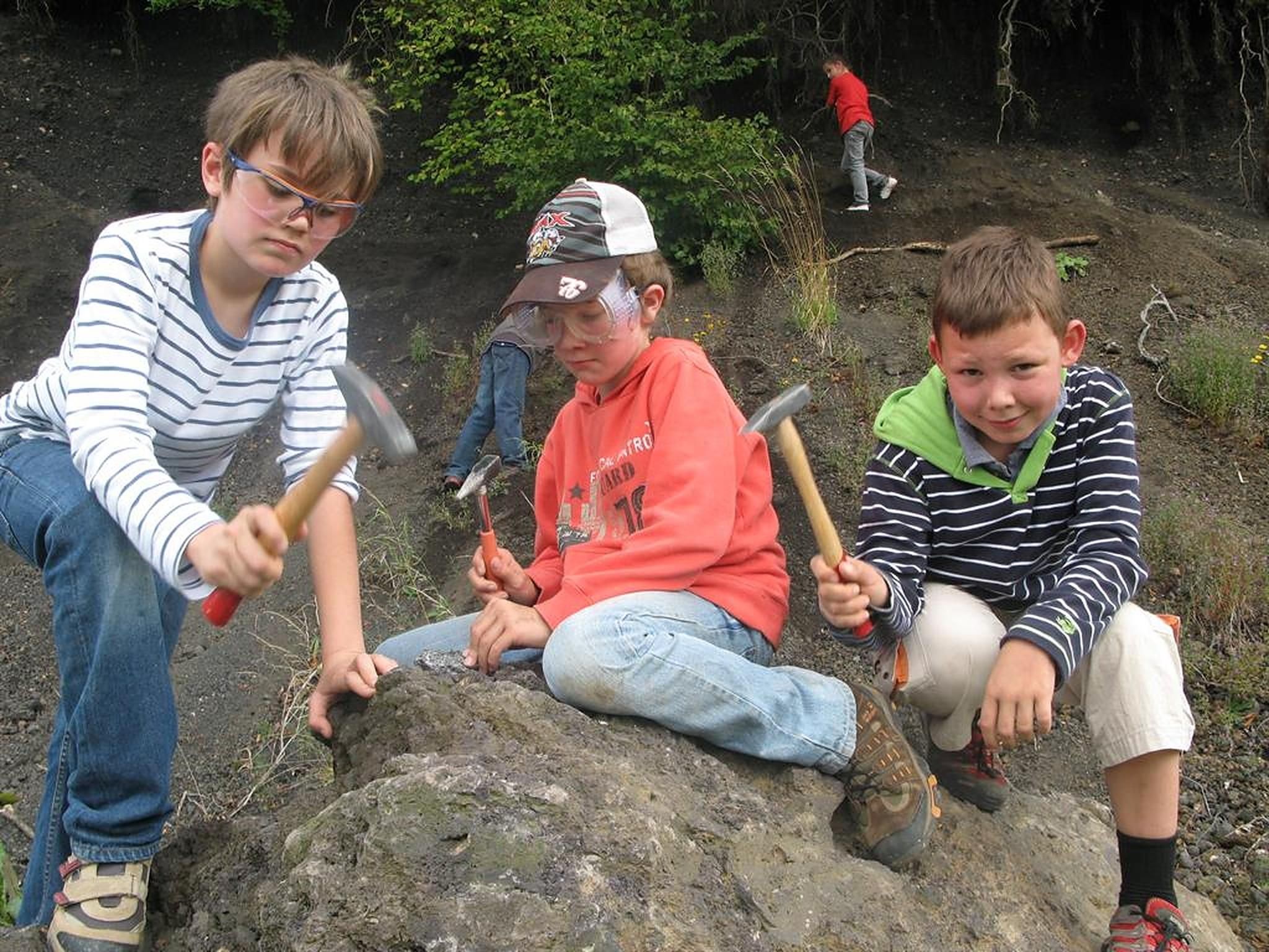 Steine üben eine magische Anziehungskraft auf Kinder aus. Sie glitzern, haben je nach Gesteinsart eine andere Konsistenz und mit Hammer und Bürste lassen sich wahre Schätze zu Tage fördern. Um dem Forscherdrang der Gesteinsdetektive gerecht zu werden, verkauft die Tourist-Information Gerolsteiner Land Geo-Beutel mit Hammer, Schutzbrille und Bürste gegen einen Preis von 9,50 €/Rucksack. Ideal für Familien mit Kindern, die Steine lieben.