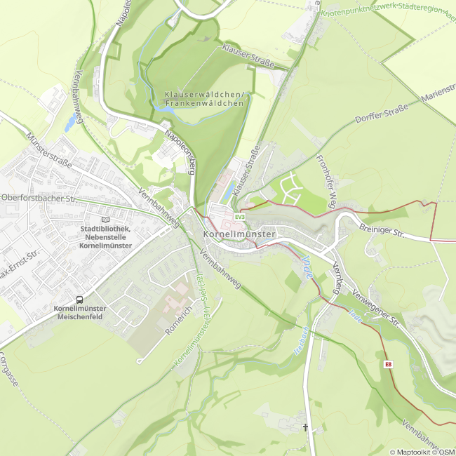 Kornelimünster ist Startpunkt des Fernwanderwegs Eifelsteig, der auf 313 km und 15 Etappen durch dei Eifel bis nach Trier führt.