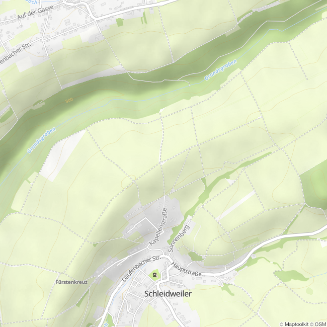 Die neugotische Kreuzkapelle im Ortsteil Schleidweiler wurde im Jahr 1894 gebaut. Ein Kreuzweg mit 14 Stationen aus individuell gestalteten Sandsteinpfeilern führt zur Kreuzkapelle, die über Schleidweiler thront. Beginnend im Kernbereich Schleidweiler begleitet den Besucher 14 Kreuzwegstationen zur Kreuzkapelle. An der Kreuzkapelle auf dem Bergrücken angekommen wird der Besucher mit einen wunderschönen Blick über die "Fidei" - vom Meulenwald bis ins Bitburger Land - belohnt.