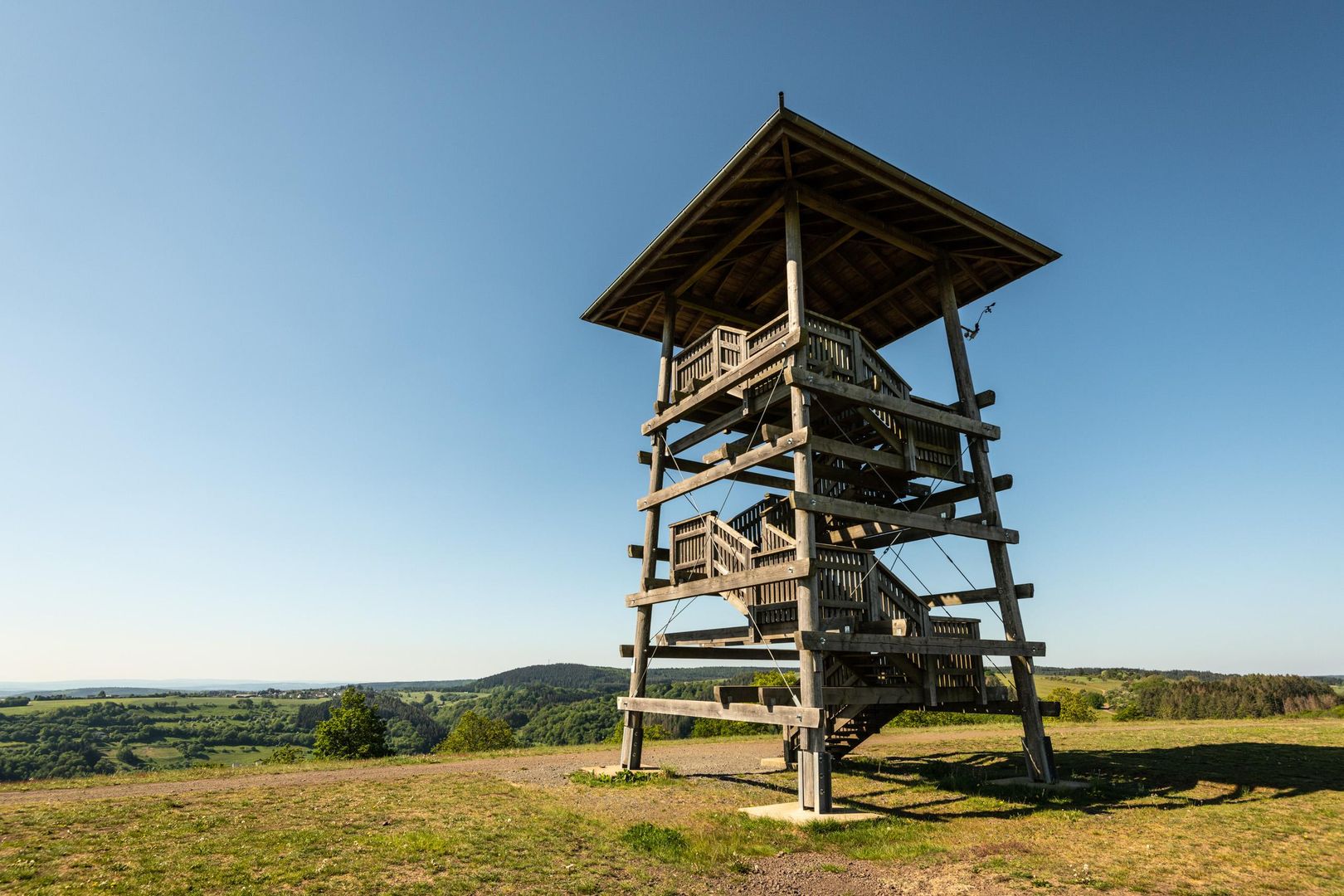 Entdecke die Aussichtsplattform „Landesblick“, die hoch oben am Kraterrand thront und eine unvergessliche Aussicht auf das Umland und das Maar von Meerfeld preisgibt. Die Anstrengungen des Aufstiegs auf 515 Meter über NN lohnen sich, denn die Weitsicht in alle Himmelsrichtungen ist fantastisch. Bänke unterhalb des Turms sind hervorragend für ein Picknick während einer Wanderung geeignet.