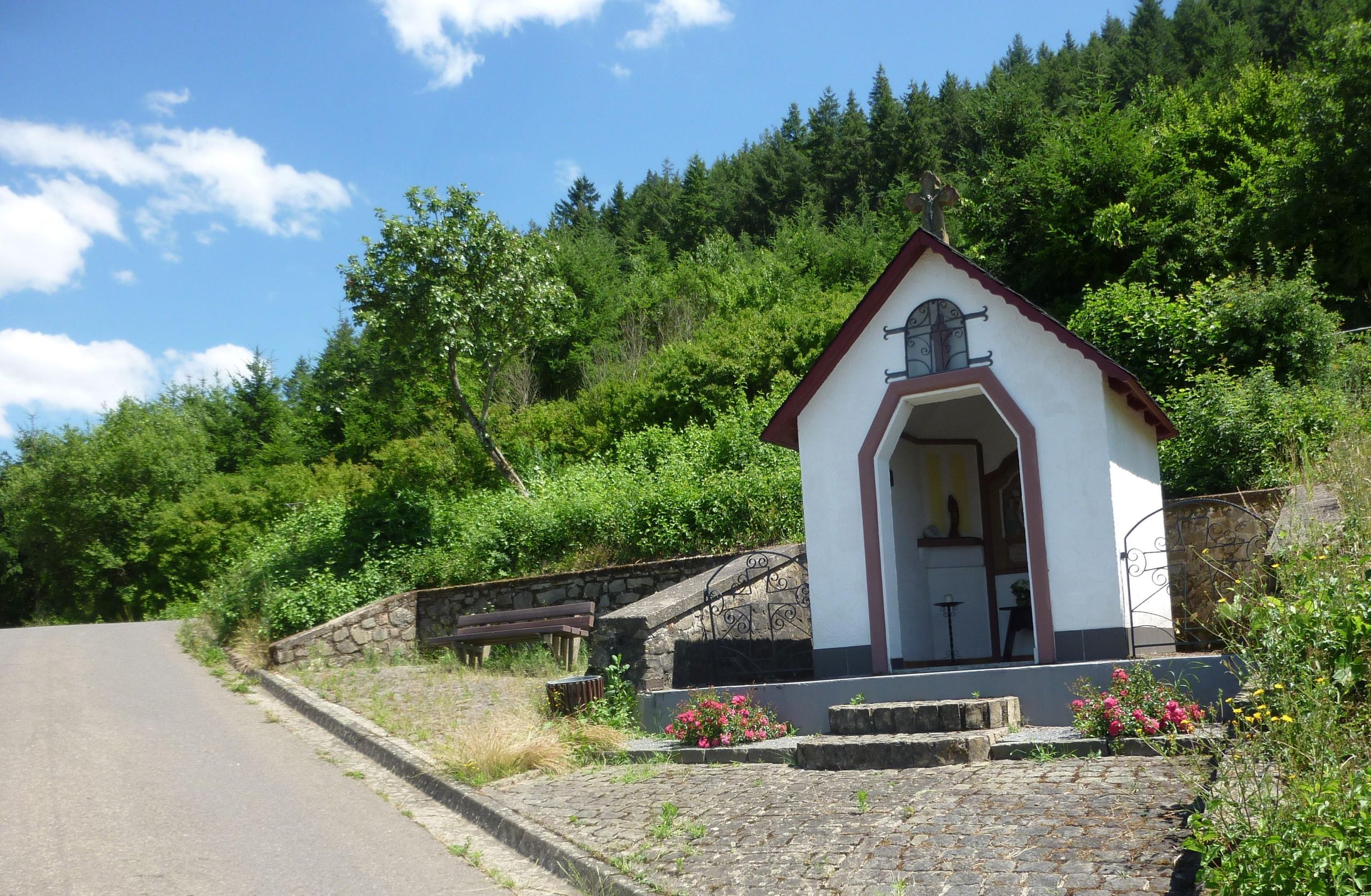 Schöne Marienkapelle, 1860 errichtet, ein Blickfang. Ein Relief der schmerzhaften Mutter Gottes ist zu sehen, davor ein Holztischchen mit Blumen und Kerzen. Der Platz ist schön hergerichtet mit Ruhebank neben der Kapelle.