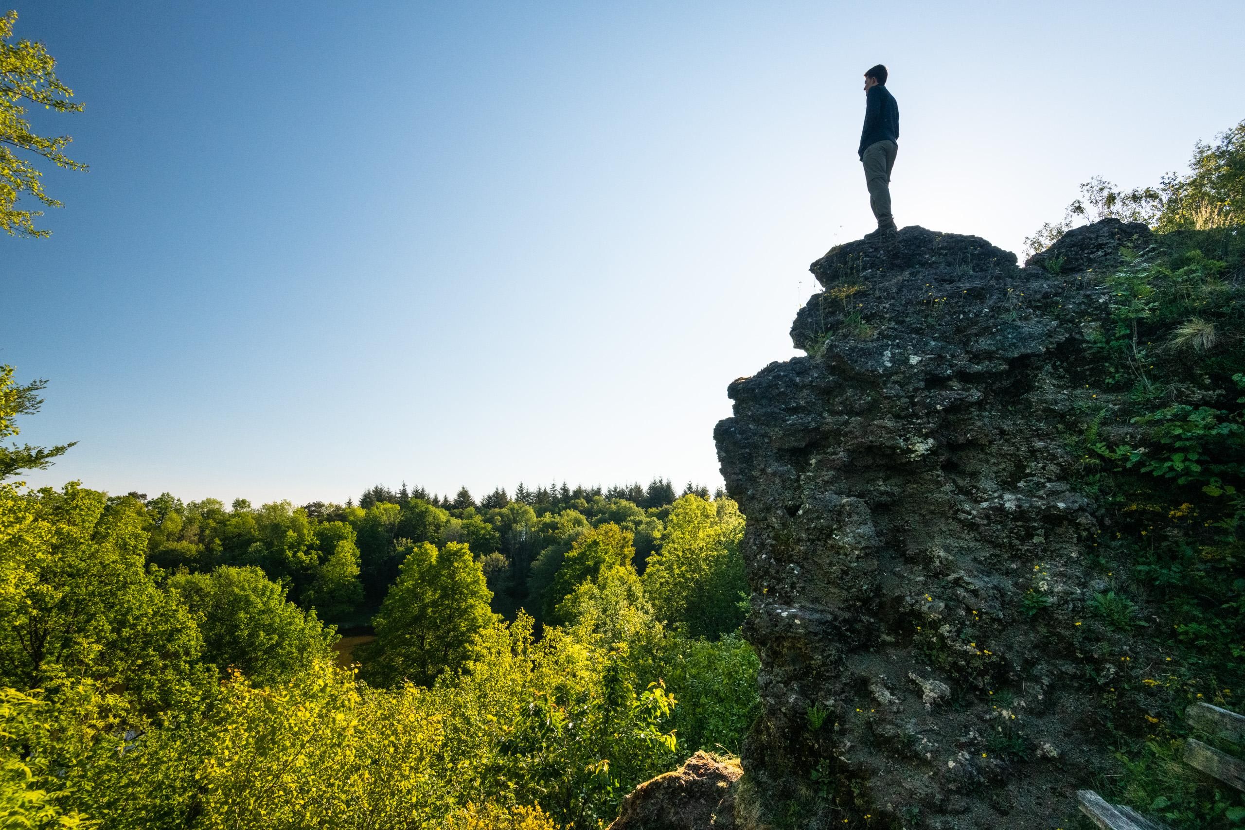 Der See ist umgeben von einem bis zu 30 Meter hohen Ringwall aus Schweißschlacken. Ein absolutes wenn auch schweißtreibendes Muss ist der Aufstieg zum über dem Wasserspiegel aufragenden Kraterrand. Ist er erst einmal erklommen, so bietet sich vom Gipfelkreuz ein einzigartiger Blick auf die umliegende Eifellandschaft und die Mosenberg-Meerfelder-Vulkangruppe.