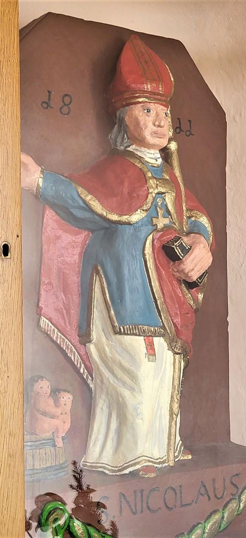 Vier alte Holzstatuen des heiligen Sebastian, des heiligen Matthias, der heiligen Katharina und der Muttergottes mit dem Kinde, ebenfalls aus der alten Nikolauskirche, waren in den Seitenwänden eingelassen. Heute befinden sich diese wertvollen Figuren in der Kirche in Neuerburg.