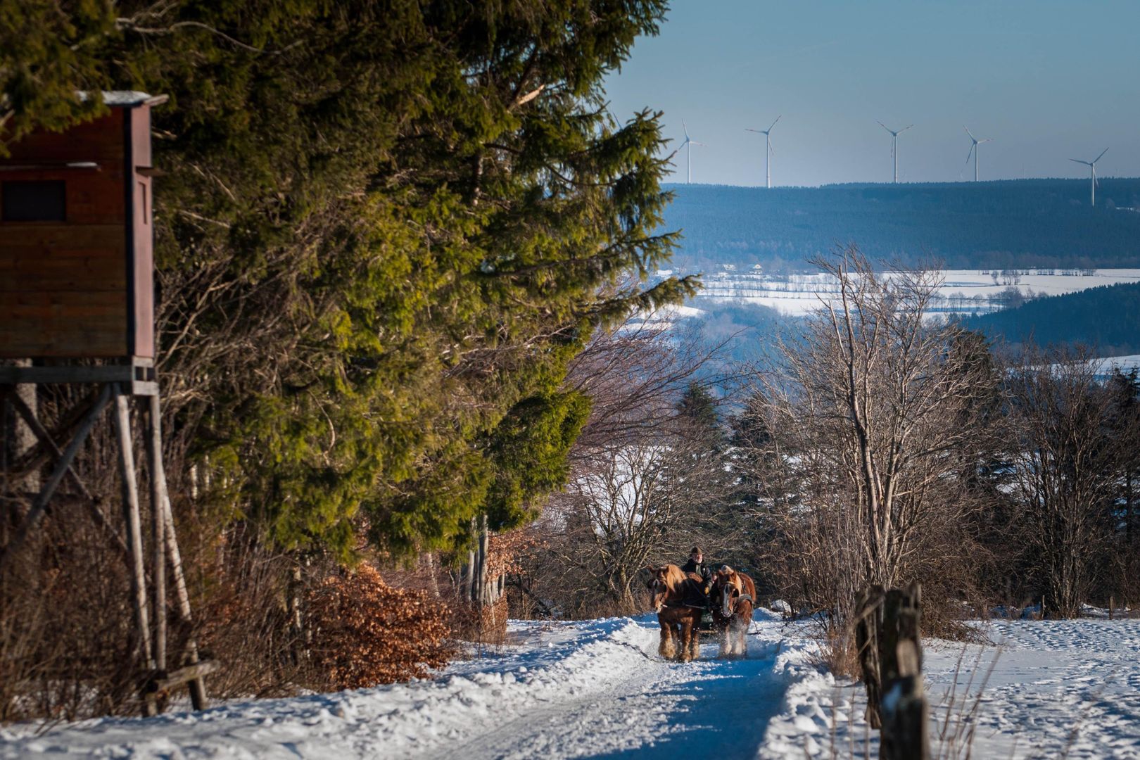 Bei Schneehöhen ab 20 cm fährt ab Mützenich ein Pferdeschlitten mit 2 belgischen Kaltblütern durch das Venn. Bei klarem Wetter reicht die Fernsicht am „Steling“, mit 658 m üNN der höchste Punkt im Kreis Aachen, bis zur Hohen Acht.
