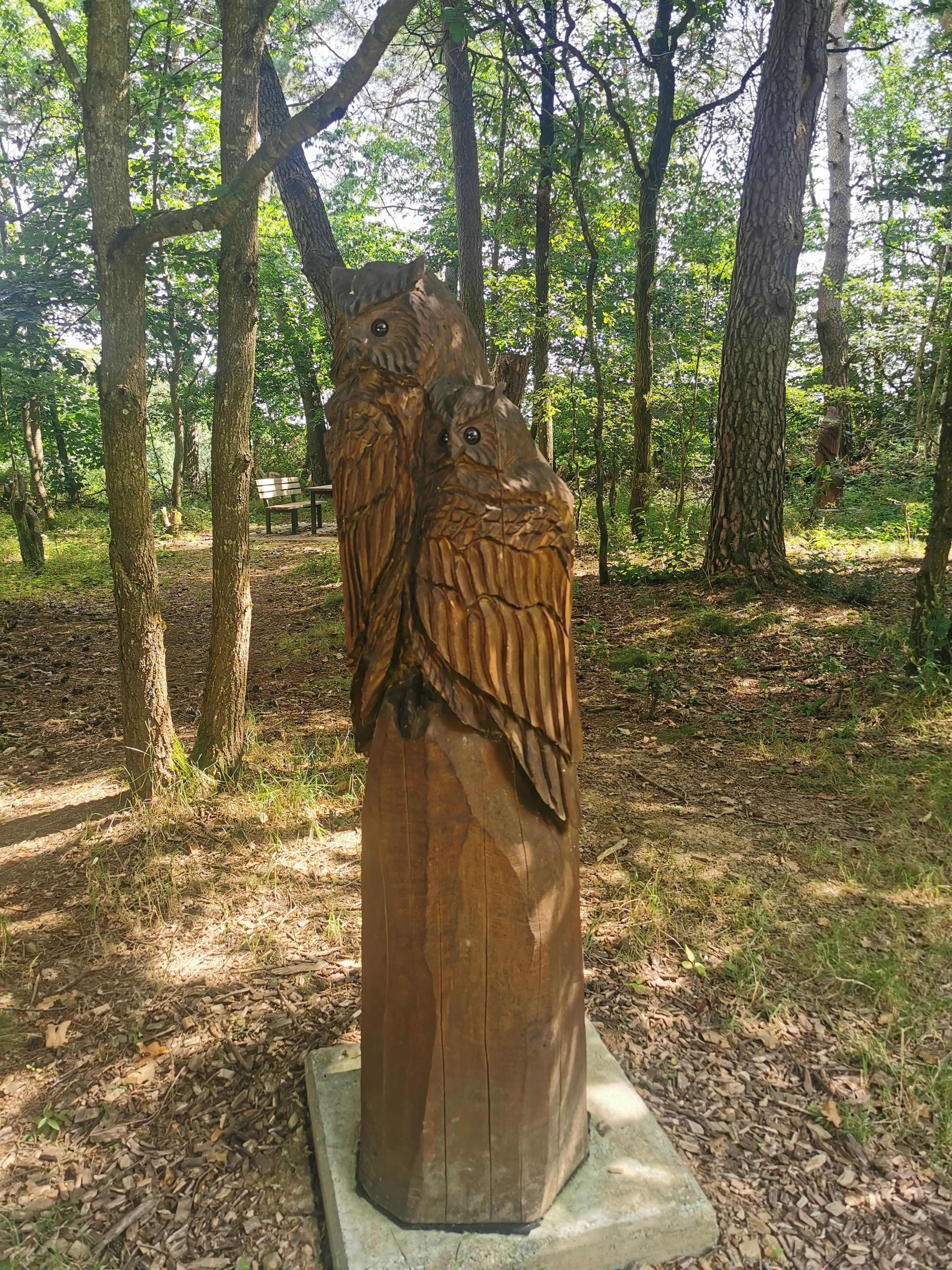 Handgefertigte Holzskulpturen lokaler Tiere, wie z.B. Rotwild, Wildschweine, Füchse, Uhus und Rehe, sind auf dem Gelände des Rastplatzes verteilt. Die Figuren sind in natürlicher Größe oder leicht überdimensioniert, um Kinder und Erwachsene gleichermaßen zu beeindrucken und die Artenvielfalt der Region greifbar zu machen.
