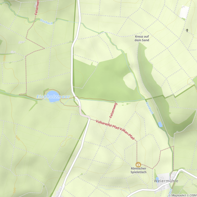 Unterhalb des Eichholzmaares finden Sie im Bachtalbereich die Mineralquelle. Den Aueler Drees erreichen Sie in ein paar Gehminuten über den Vulkanpfad ab dem Eichholzmaar. Die Mineralquellen fördern CO2-haltiges Wasser, welches einen hohen Eisen- und Mangangehalt aufweist. Dies machen die rötlichen Verfärbungen am Quellbecken sichbar.