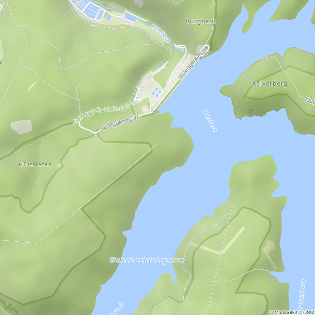 Beeindruckend auch noch heute: Die frühere Landstraße Nummer 11 zwischen Kleinhau und Schevenhütte verläuft quer durch die Wehebachtalsperre und wurde durch die Stauung des Wehebachtals unpassierbar.