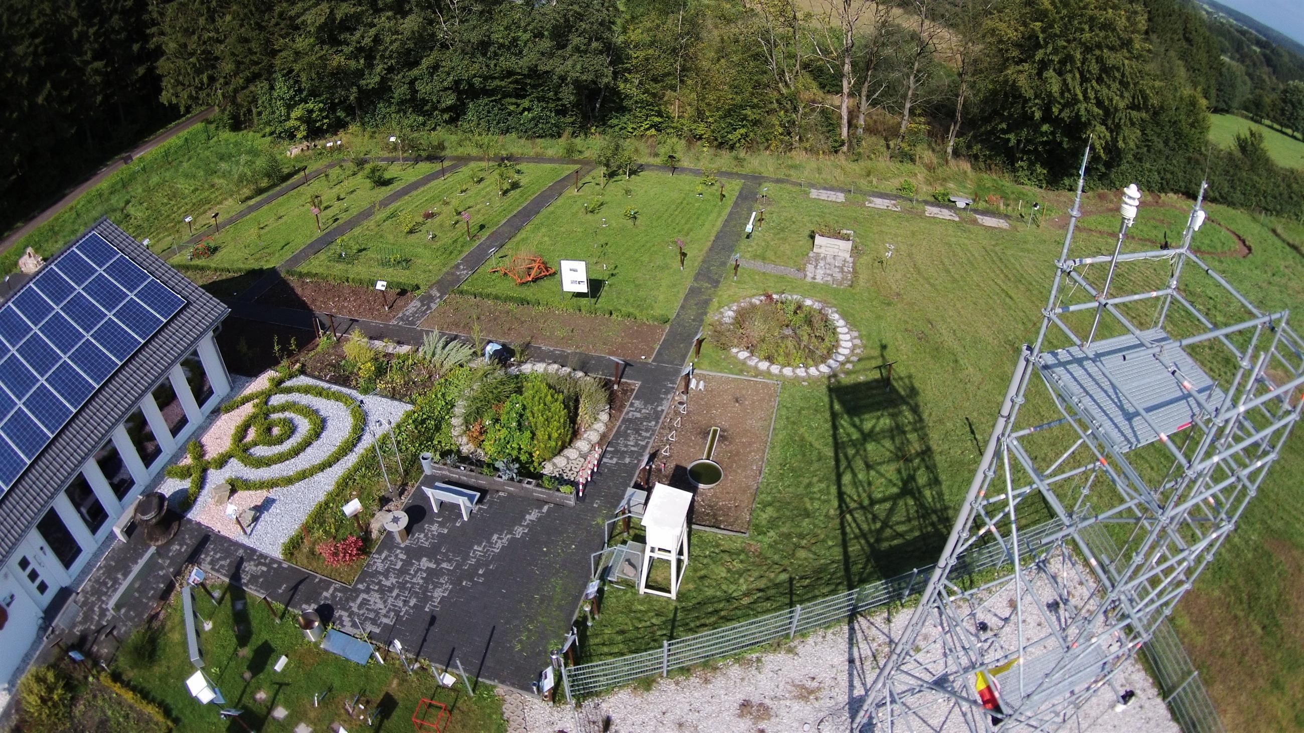 Im Außengelände erläutern über 30 Tafeln zum Beispiel die Funktionen der Wetterstation und ihrer Instrumente, es gibt einen Mikroklimapfad und Sie können selber testen, wie Sie Temperaturen empfinden.
