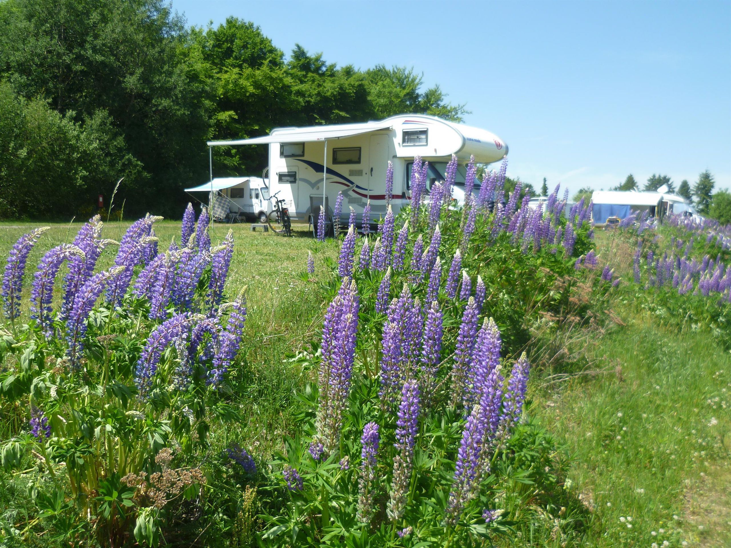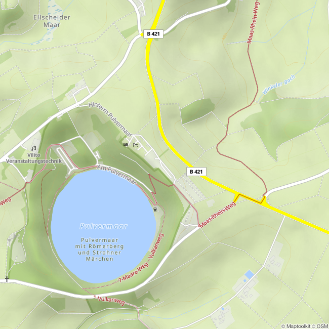 Die Lage auf dem Kraterwall des Pulvermaares vor hohem Buchenwald mit Blick über die Landschaft der Vulkaneifel ist einzigartig. Nur 7 km von der A1/48 entfernt gelangen Sie über die B421 zum Pulvermaar. Die Einrichtungen des benachbarten Feriendorfes Pulvermaar stehen zur Verfügung. Anmeldung an der Feriendorf-Rezeption.