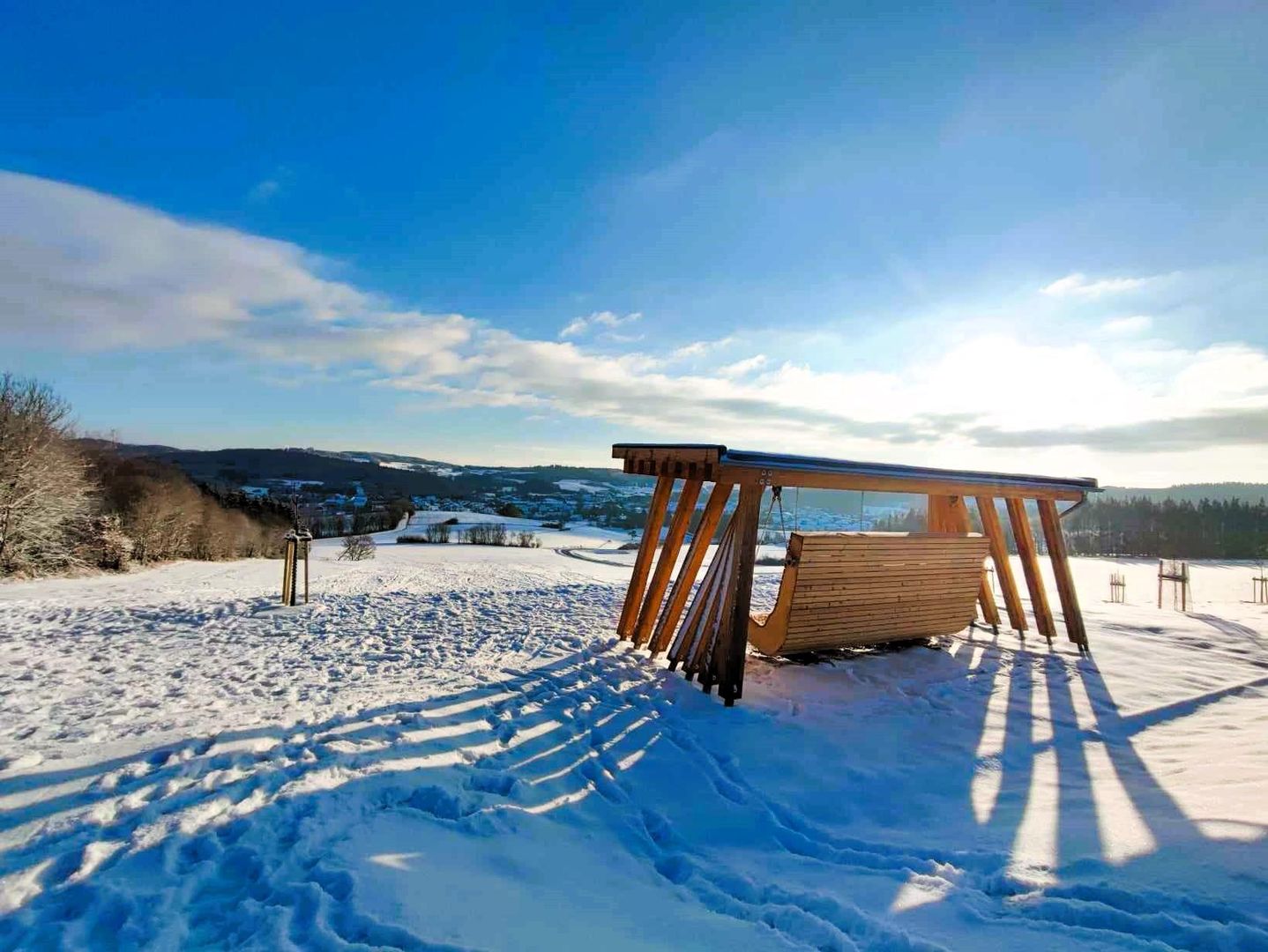 Mit einer Breite von 4,34 Metern und einer Höhe von 3,50 Metern, ist sie von einem Gründach geschützt. Sie bietet Platz für mindestens zehn Personen und bietet einen herrlichen Panoramablick auf Kelberg und den Hochkelberg. Der Fotopunkt, ein charakteristisches Eifelfachwerkhaus bietet ein weiteres Highliht und einen traumhaften Blick zum tertärvulkan Hochkelberg und den Ort Kelberg. Ganzjährig offen
