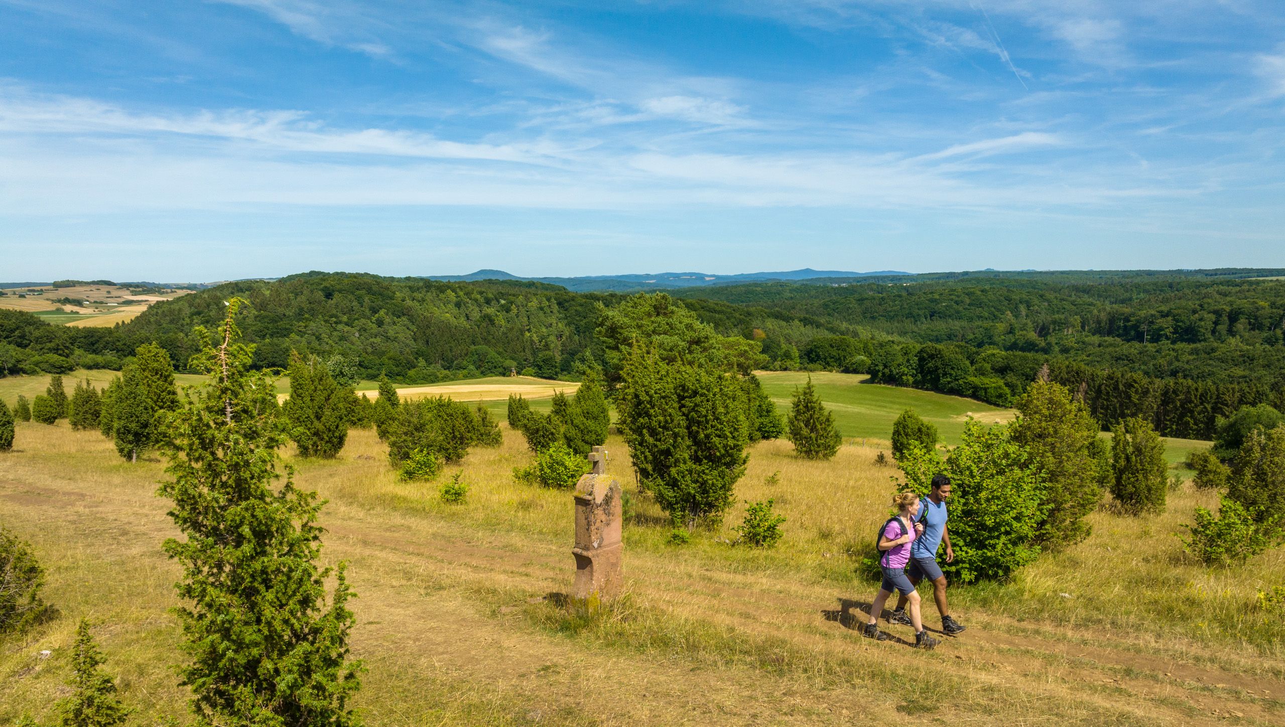 Nach der Rast geht es weiter durch Wälder und Wiesen und der Horizont wird langsam weiter. Hinter Alendorf eroberst Du Schritt für Schritt einen Gipfel auf 520 Metern Höhe: Es ist der Kalvarienberg. Ein frischer Wind zaubert Dir ein Lächeln ins leicht erhitze Gesicht. Du bist oben angekommen, ein Gefühl von Freiheit und Stolz stellt sich ein. Die Luft ist so rein hier oben, die Aussicht offen in alle Richtungen, Du atmest erst einmal tief durch und genießt den Moment. Du nimmst Dir etwas Zeit hier oben und entdeckst klein gewachsene, schlanke, grüne Bäumchen. Wacholder wächst hier. Ihm zu Ehren feiert Alendorf jedes Jahr ein Fest, Wacholderschnaps ist eine der Spezialitäten.