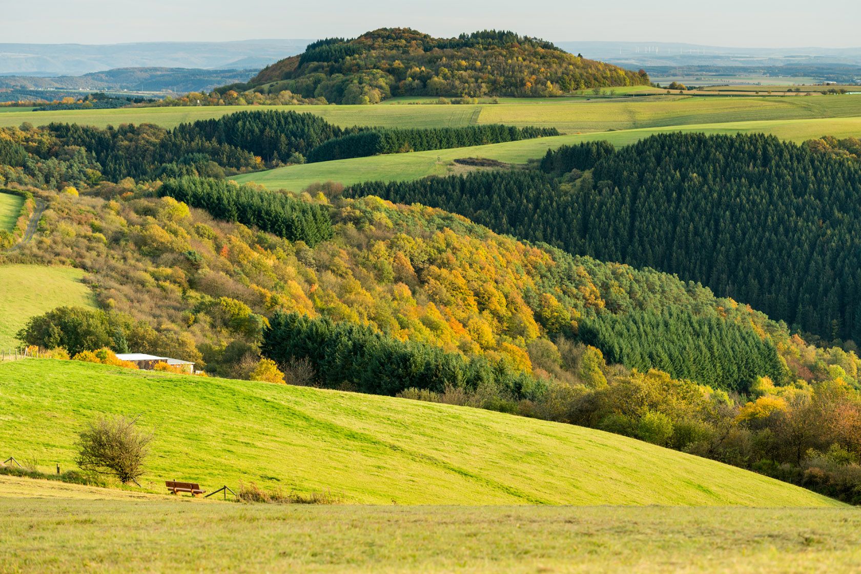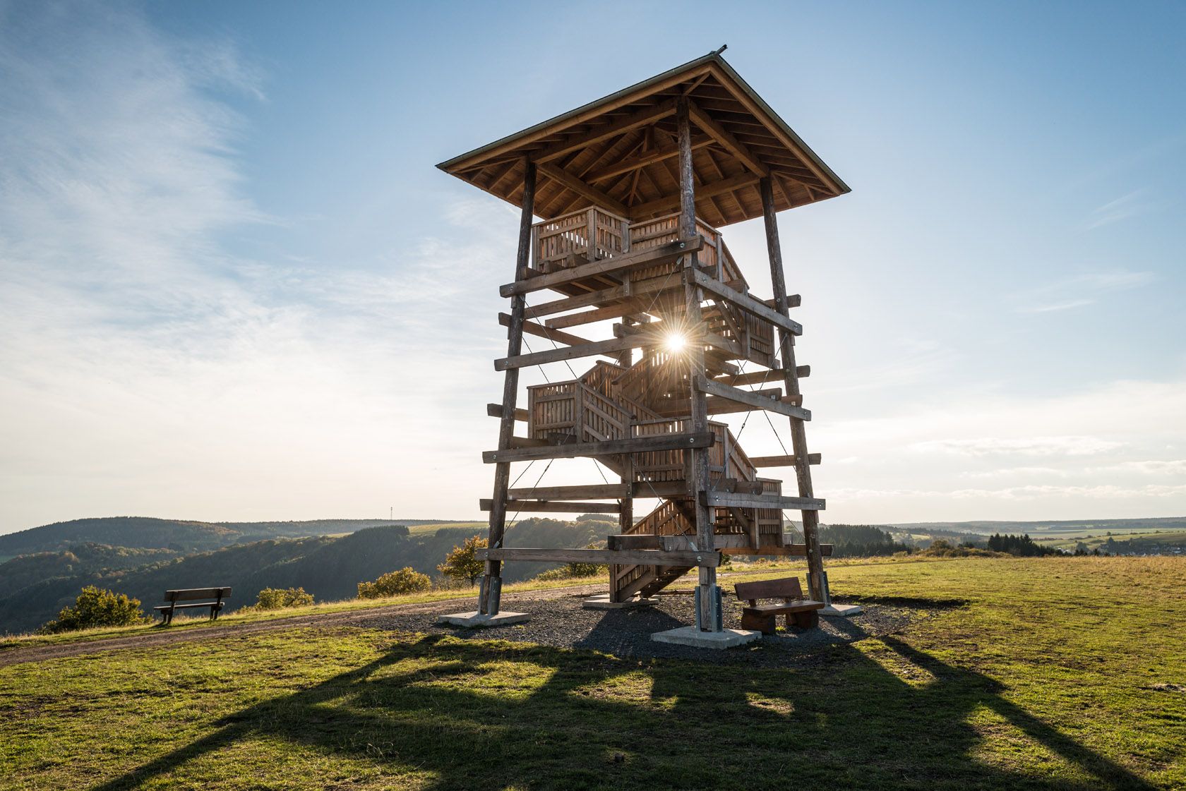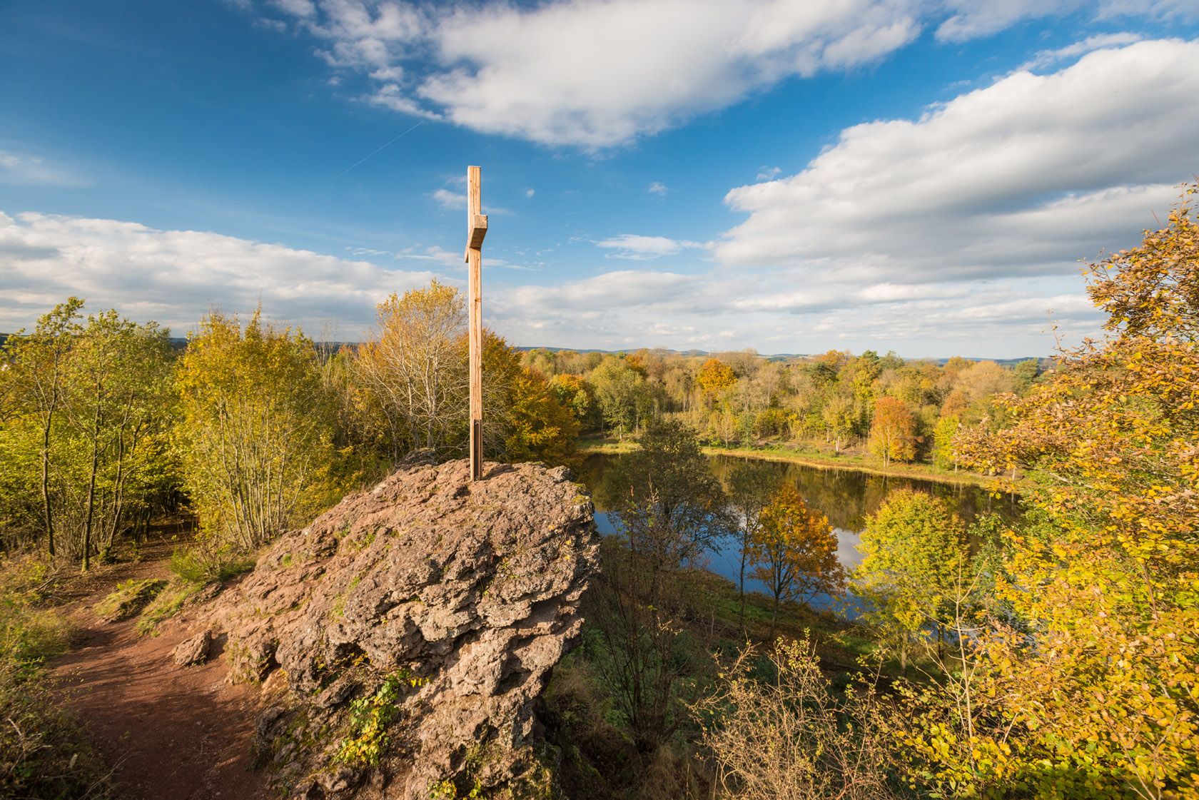 Je nach Witterung herrscht hier eine neblig-mystische bis naturbelassen-ruhige Stimmung – in jedem Fall eine außergewöhnliche Oase der Ruhe. Die erste Etappe endet am Meerfelder Maar, das direkt neben dem gleichnamigen Ort in einem riesigen Vulkantrichter liegt. Wie tief dieser Trichter ist, spürst Du Anfang der zweiten Etappe beim Aufstieg zum Landesblick. Die wunderbare Weitsicht, die von der Aussichtsplattform auf das weit unten gelegene Meerfeld mit dem Maar möglich ist, hast du dir nach den zurückgelegten Höhenmetern redlich verdient. Ab dann folgen ruhige Waldabschnitte, die einen herrlichen Kontrast zur erlebnisreichen ersten Etappe bilden. Besonders schön ist der Abschnitt rund um die Bleckhausener Mühle, die ganz zurückgezogen im Tal der Kleinen Kyll liegt. Zum Schluss geht es durch das Liesertal zurück nach Manderscheid.