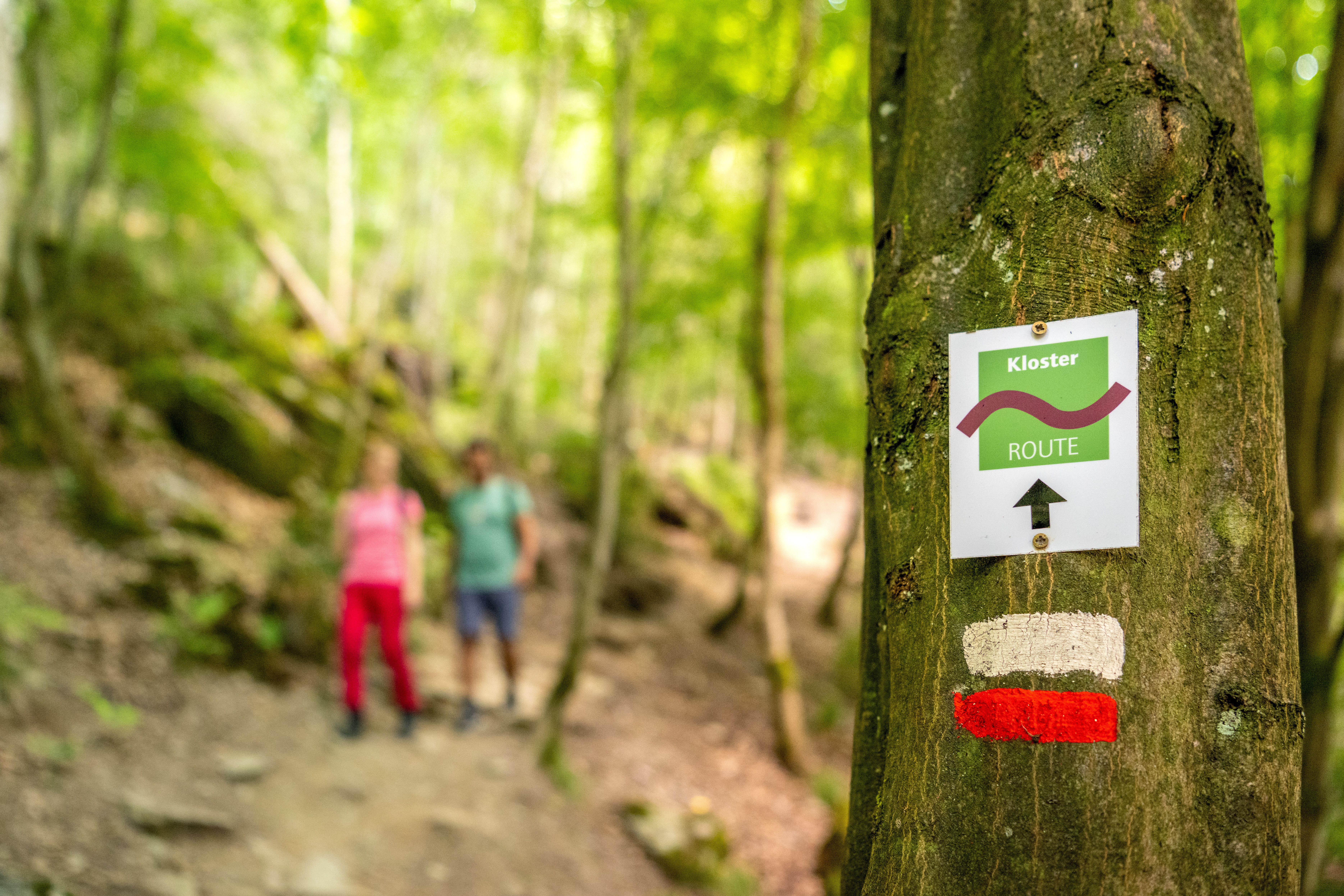 Hier weisen die Logos des jeweiligen Partnerwegs den Weg. Auch hier findet man das Logo auf Plaketten, als Sprühmarkierung oder auf den wegweisenden Schildern wieder.