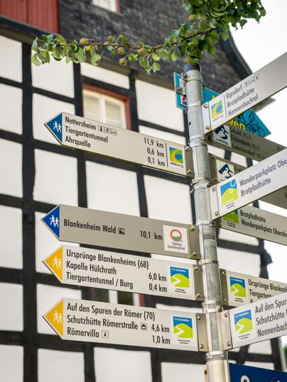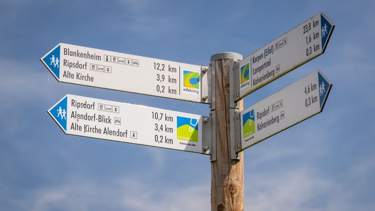 Die wegweisenden Schilder des Eifelsteigs haben eine blaue Spitze. Teilweise sind die Schilder durch das Eifelsteig-Logo und die Logos der Partnerwege ergänzt.