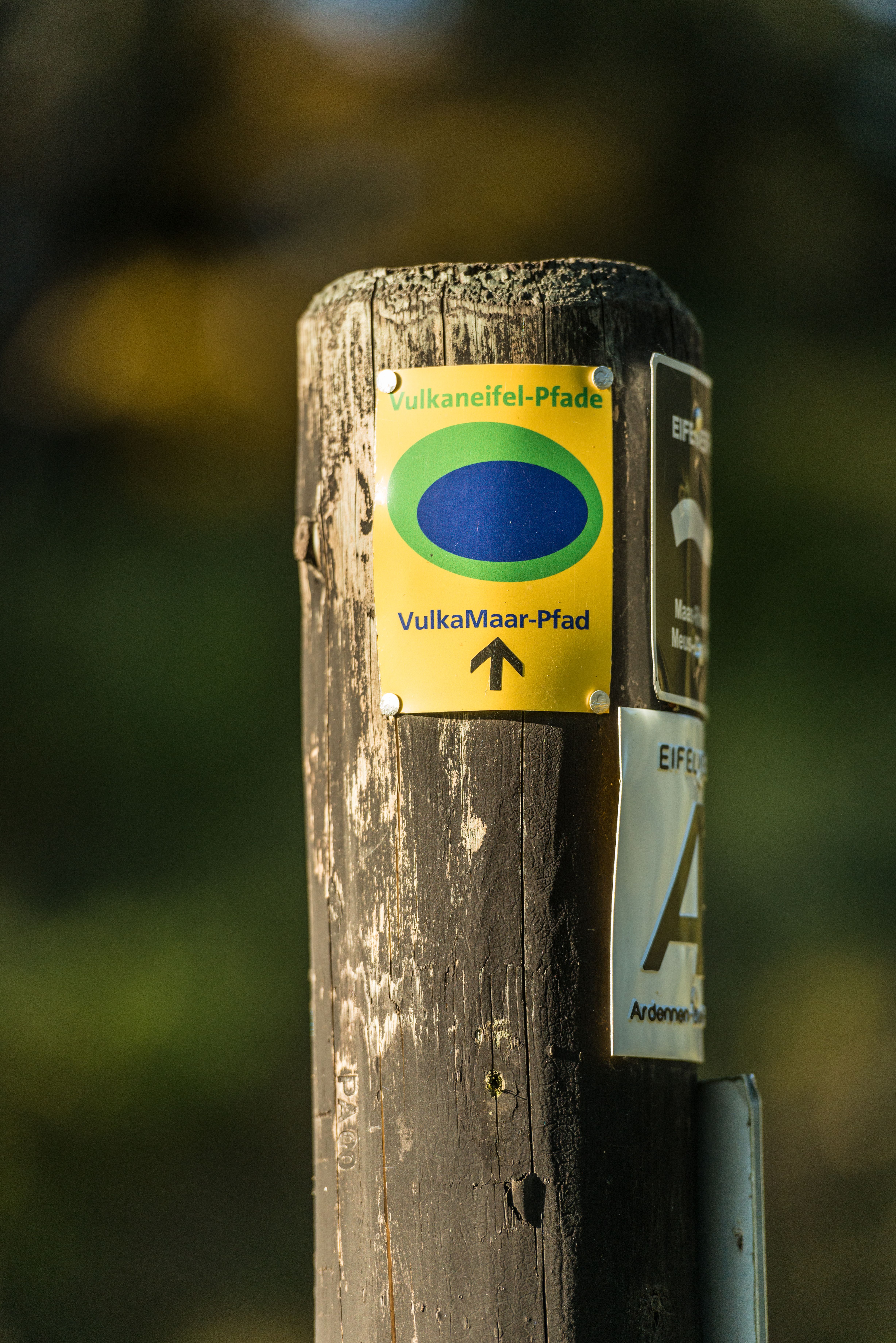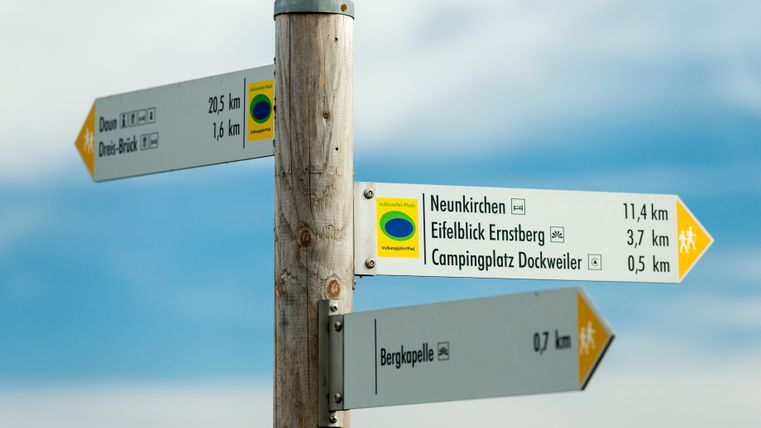 Die wegweisenden Schilder der Partnerwege und der Zuwege zum Eifelsteig haben im Gegensatz zum Eifelsteig eine gelbe Spitze.