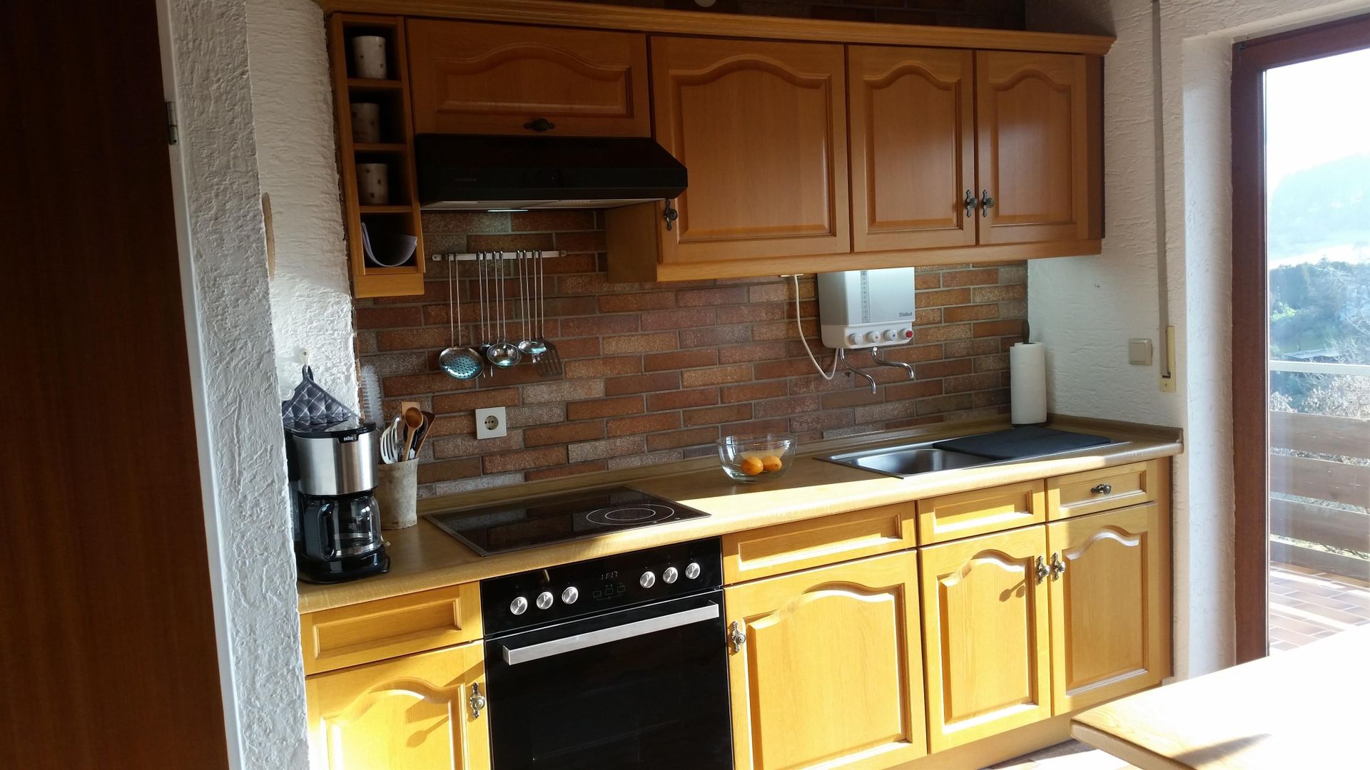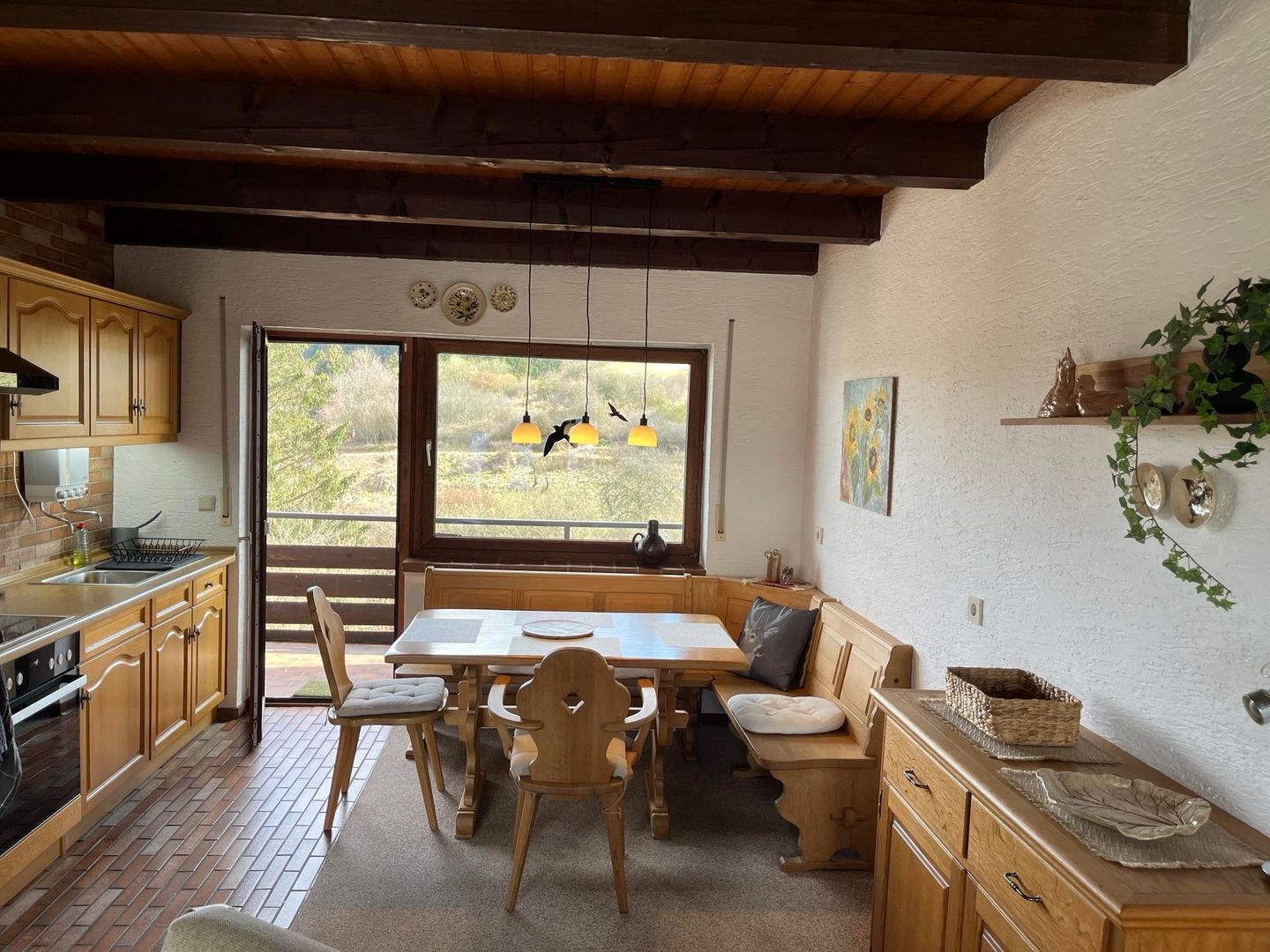 Die Küchenzeile ist mit Elektroherd (4 Platten), Backofen, Kühlschrank mit Gefrierfach sowie Kaffeemaschine und Toaster komplett ausgestattet. Die Essecke bietet ausreichend Platz- auch für gemütliche Spieleabende.