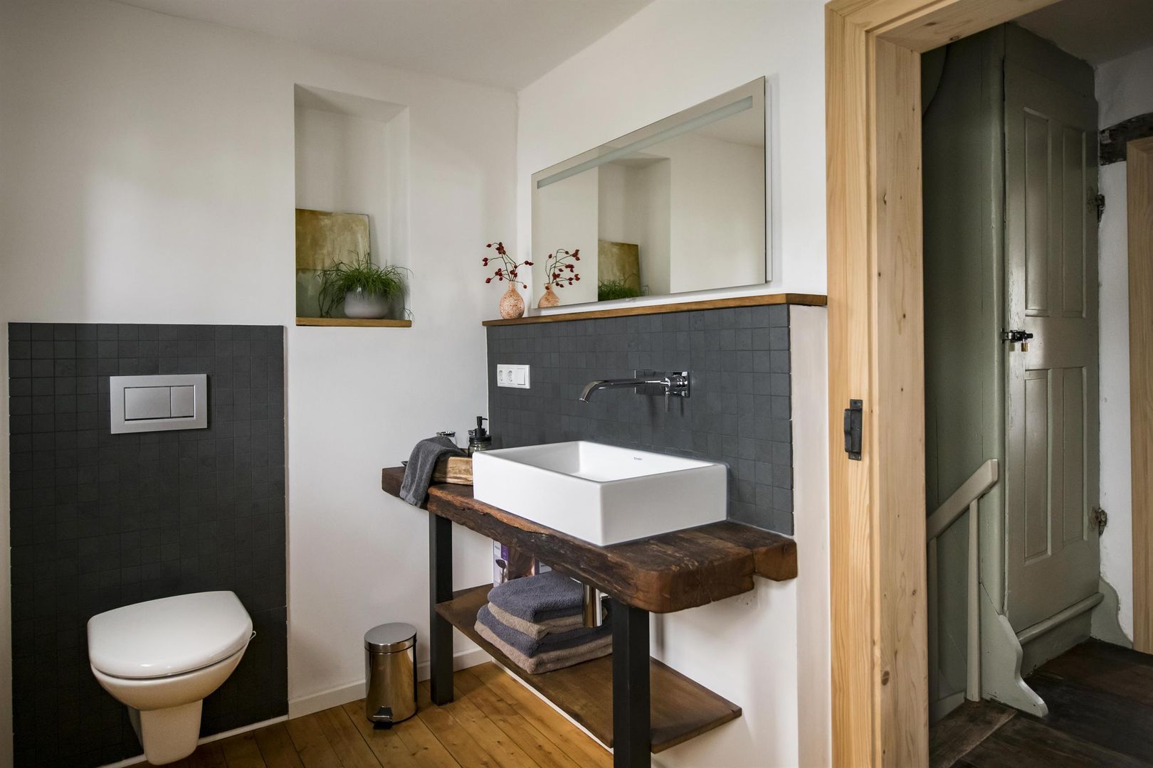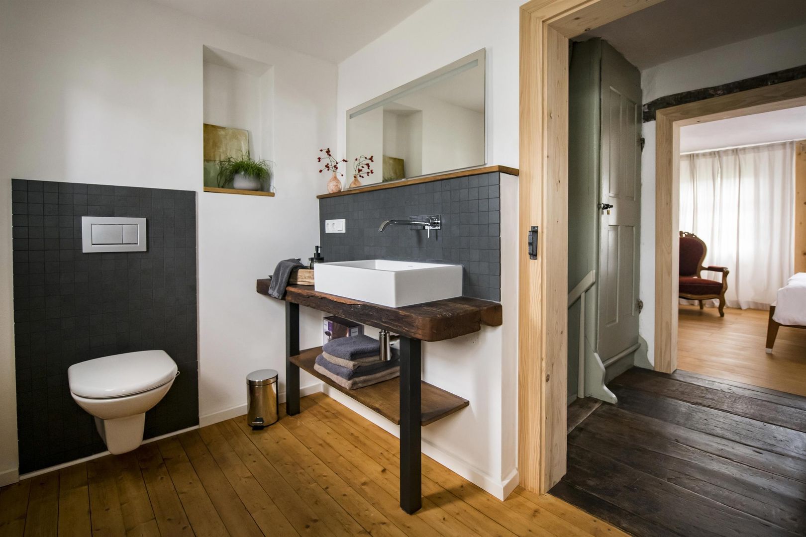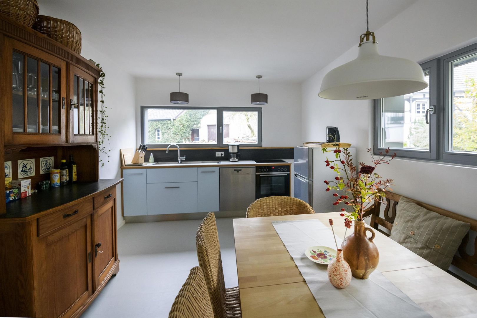 Ein ökologisch saniertes Bauernhaus aus dem 18. Jahrhundert mit einem modernisierten Anbau bietet Raum und Ambiente für einen entspannten und zugleich komfortablen Urlaub. Eine zeitgemäße moderne Küche mit Sitzecke und Wandheizung steht im schönen Kontrast zu der restaurierten Treppenanlage, den alten Türen mit Kastenschlössern und alten Holzböden.