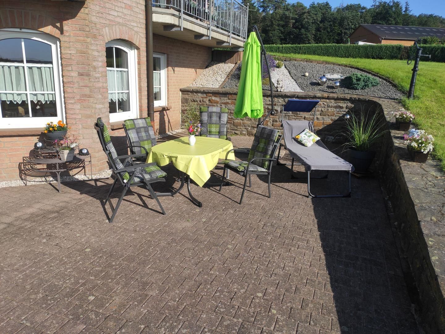 Vom Wohnzimmer aus betritt man ebenerdig eine schöne große Terasse. Sie ist komplett mit Tisch, Stühlen, erhöhter Liege, Sonnenschirm und einem Elektrogrill ausgestattet.