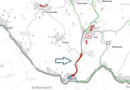 Vom 12. Mai bis Ende Juli 2025 ist die Bundesstraße 257 auf dem Abschnitt zwischen der Anschlussstelle Echternacherbrück und der Anschlussstelle Zweikreuz/Irrel/Ernzen aufgrund von Sanierungsarbeiten in beide Richtungen voll gesperrt. Eine Umleitung ist über Minden und Irrel ausgeschildert…